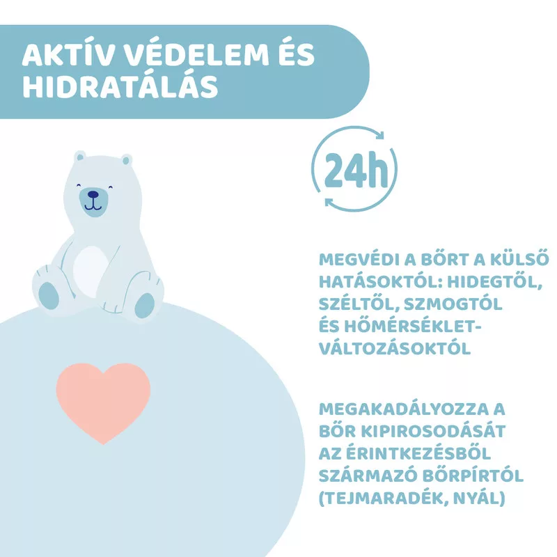 Baba arckrém: mélyen táplálja a bőrt, fenntartva a megfelelő hidratáltságot. Egész nap (24 óra) védi a külső hatásoktól (hideg, szél, szmog, hőmérsékletváltozások) és az érintkezésből származó bőrpírtól (tejmaradék, nyál), miközben szabadon lélegezhet. Ásványi olaj mentes. A klinikailag tesztelt formula extra kíméletes a baba bőréhez a shea vajnak és az E-vitaminnak köszönhetően. Ideális száraz és érzékeny bőr esetén is. Gyorsan felszívódik. Nem zsíros. Használati utasítás: tiszta és száraz bőrre vigye fel.