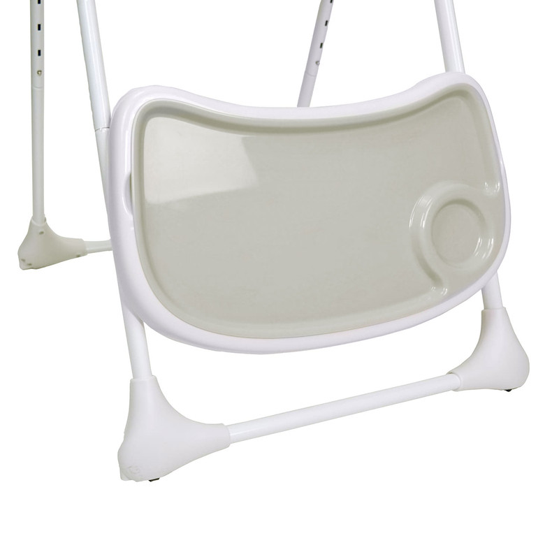 A szék tároláshoz összecsukható, önmagában megáll. A tálca a hátsó lábazati kampókra akasztva tárolható.