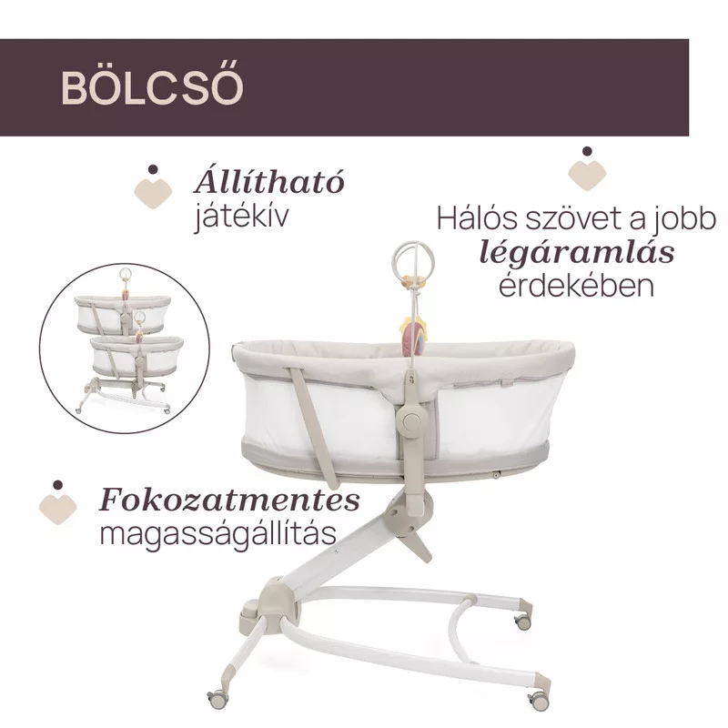 - A bölcsö oldalai körbe hálósak, így a szellőzés is jobb lett, illetve oldalról is rátekinthetünk gyermekünkre. A bölcsőn lévő játékrúdon puha függő játékok találhatók.