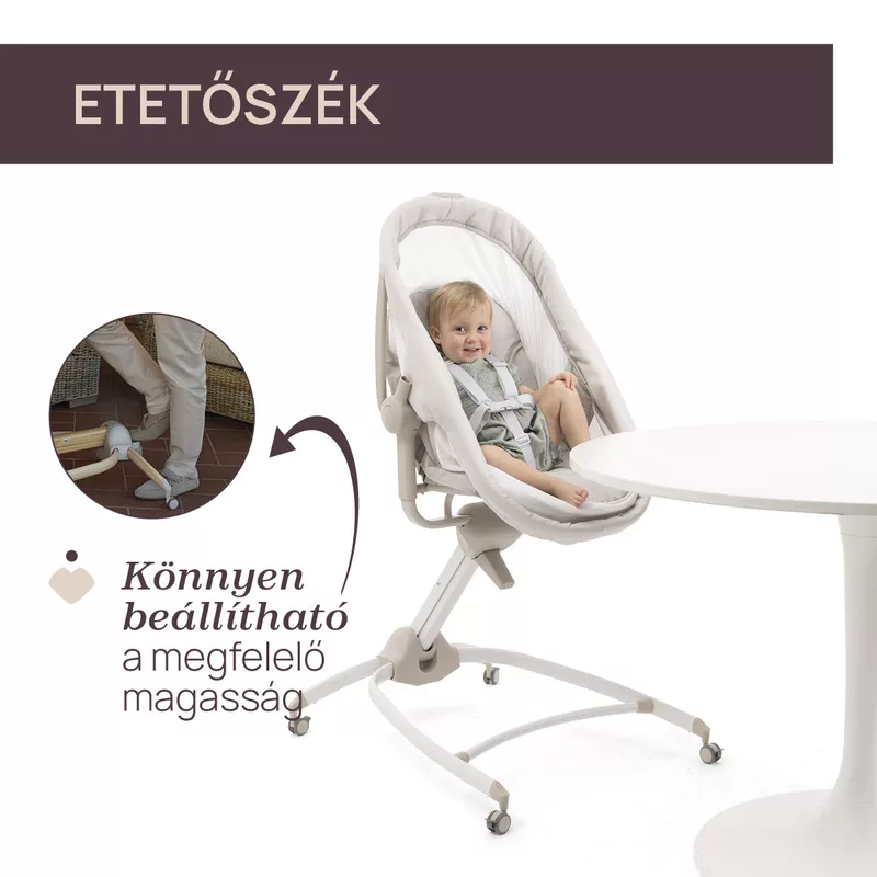 - Etetőszék funkcióban a babát az ötpontos biztonsági öv védi a kieséstől.