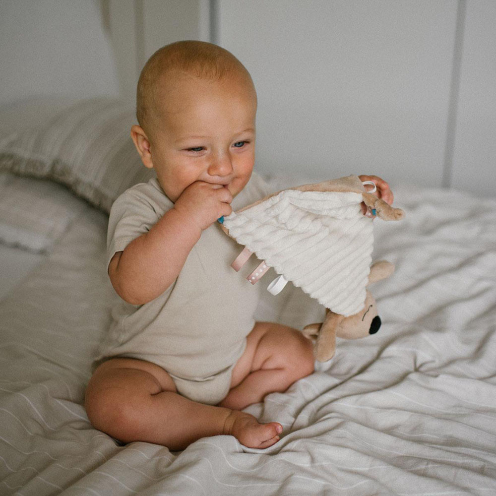 A csomók, a nagy fülek és a kezek segítik a babát a kézügyesség elsajátításában. A színes címkék további érzékszervi ingereket biztosítanak.