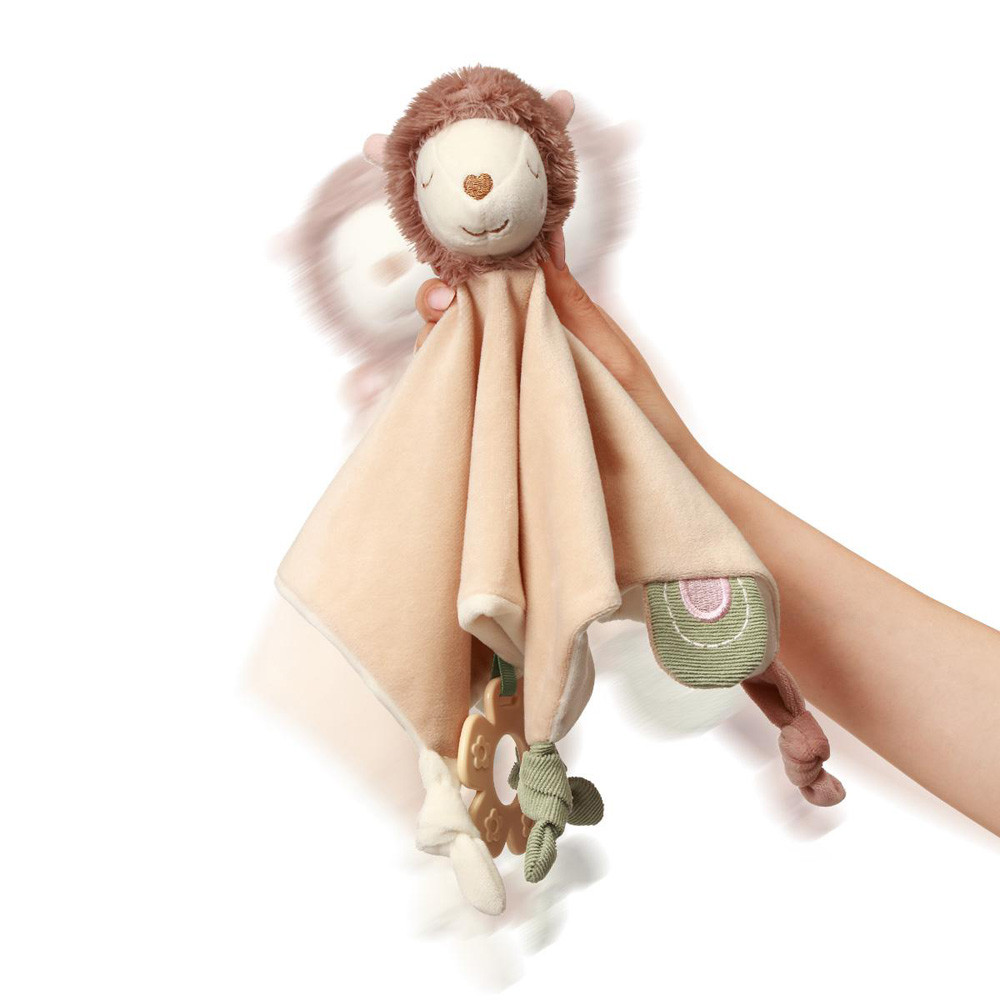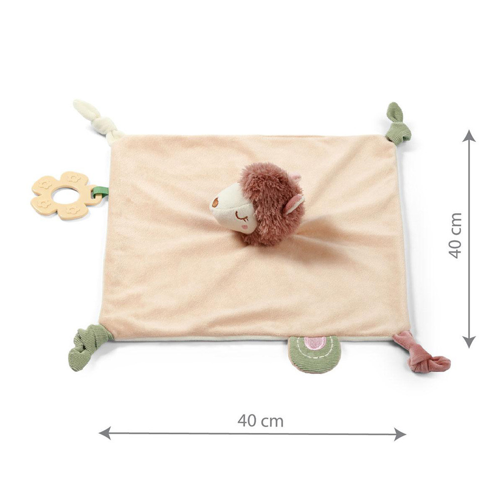 Fejlesztési és érzékszervi tulajdonságokat kínál. A kendő szélén lévő csomók és finoman zörgő kis fülecske segítik a babát a kézügyesség elsajátításában. A játék belsejéből halk csörgés hallatszik. Gyengéden serkenti a baba hallását és felkelti érdeklődését.