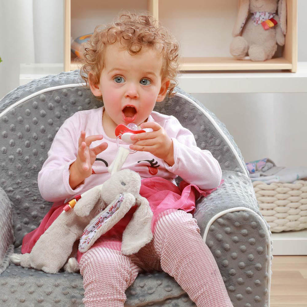 A nyuszi szundikendő a baba legjobb barátja lehet. Tökéletes alvótárs és játszótárs lesz. A színes címkéknek köszönhetően a baba nem fog unatkozni, miközben a cumitartó gondoskodik arról, hogy a cumi mindig a közelben legyen. Ideális első bújós játék lesz egy baba számára.