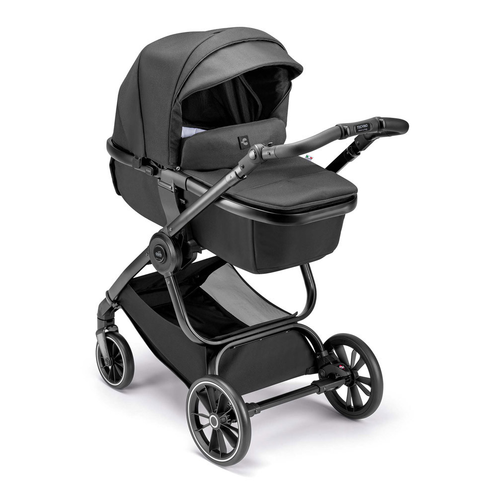 Tartalma: Techno Deluxe váz, mózeskosár, babakocsi ülés, hordozó, pelenkázótáska.