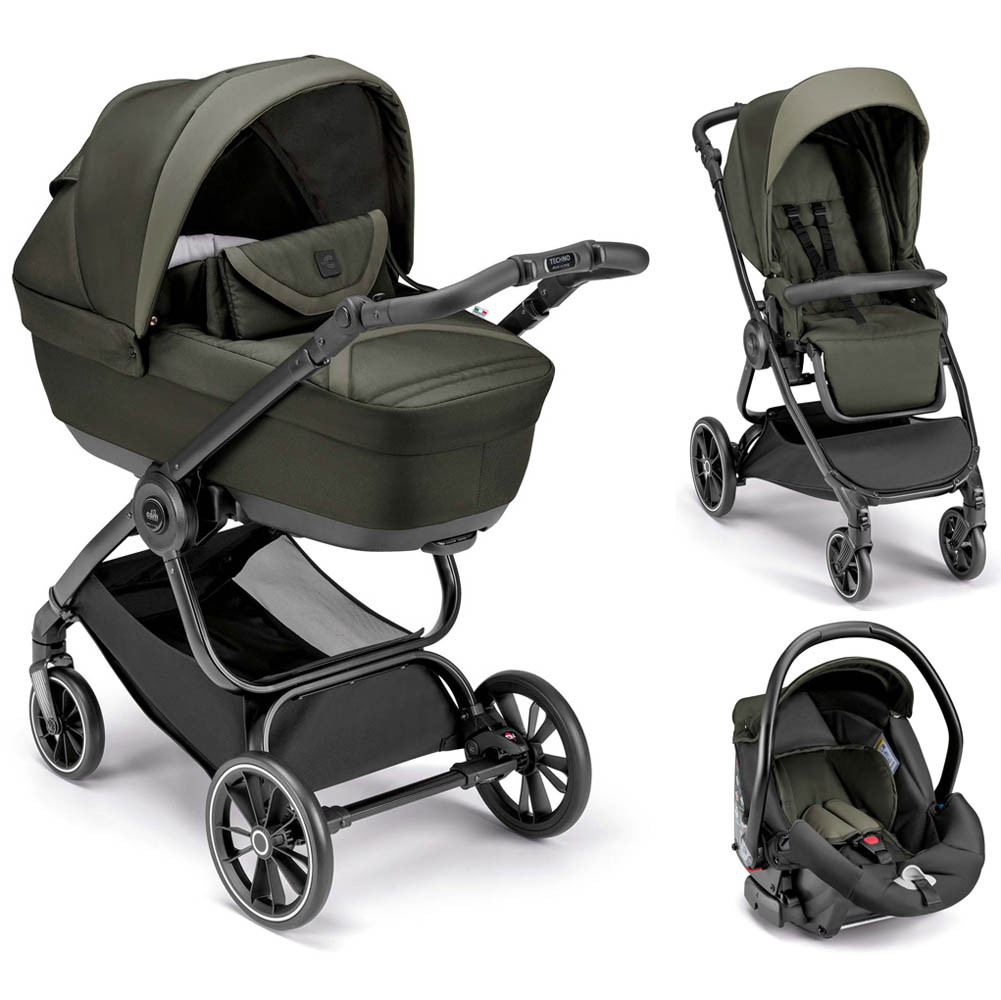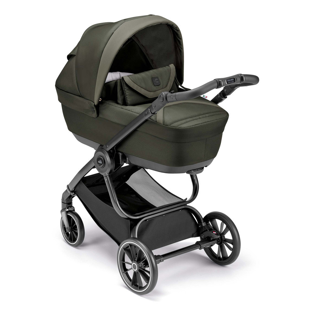Tartalma: Techno Deluxe váz, mózeskosár, babakocsi ülés, hordozó, pelenkázótáska.