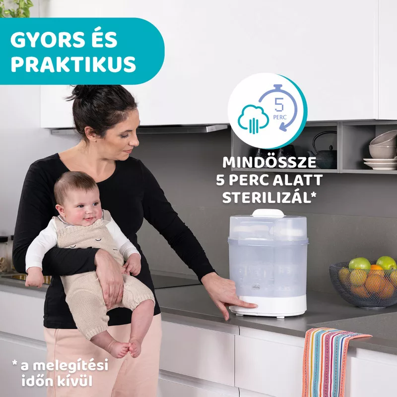 Gyorsan, természetesen és hatékonyan sterilizálja a cumisüvegeket, mellszívó sterilizálandó részeit és a kis tárgyakat. Használjon gőzt a tárgyak természetes sterilizálásához, így eltávolíthatja a háztartási káros baktériumok 99,9%-át!
