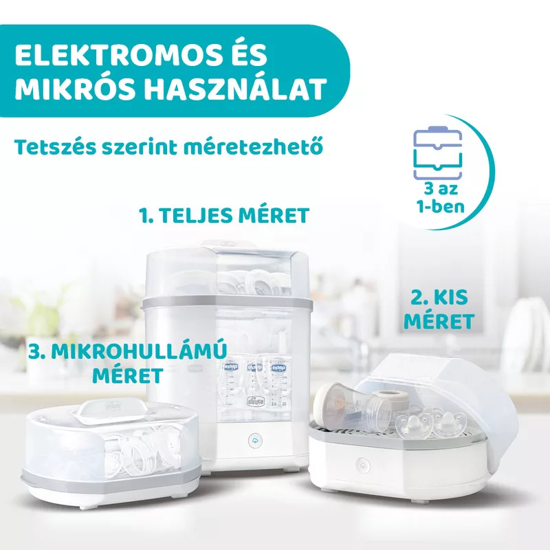 FULL SIZE: a legnagyobb teljes méret, több cumisüveg, cumi és egyéb vagy mellszívó számára, elektromos gőzképzés.