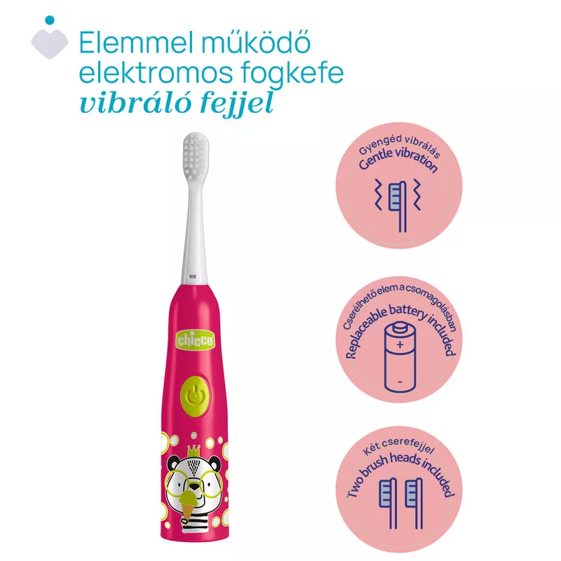 Elemmel működő elektromos fogkefe rezgő kefefejjel. A rezgő kefefej a nagyon puha, kúpos sörtékkel és az ultravékony végekkel együtt gyengéden tisztítja a fogzománcot és az érzékeny ínyt. Új barátaival, egy tigrissel és egy pandával a fogmosás élvezetes rutinná válik!