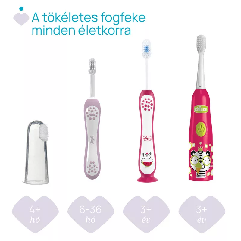 Tejfogak tisztítására. A finoman rezgő Chicco elemes fogkefe a kúpos technológiájú és a nagyon finom puha sörtékkel extra gyengéd a fogzománchoz és a fogínyhez. A fogak közti réseket a speciális sörték jobban elérik, és a lerakódások eltávolítása hatékonyabb, összehasonlítva egy hagyományos fogkefével.