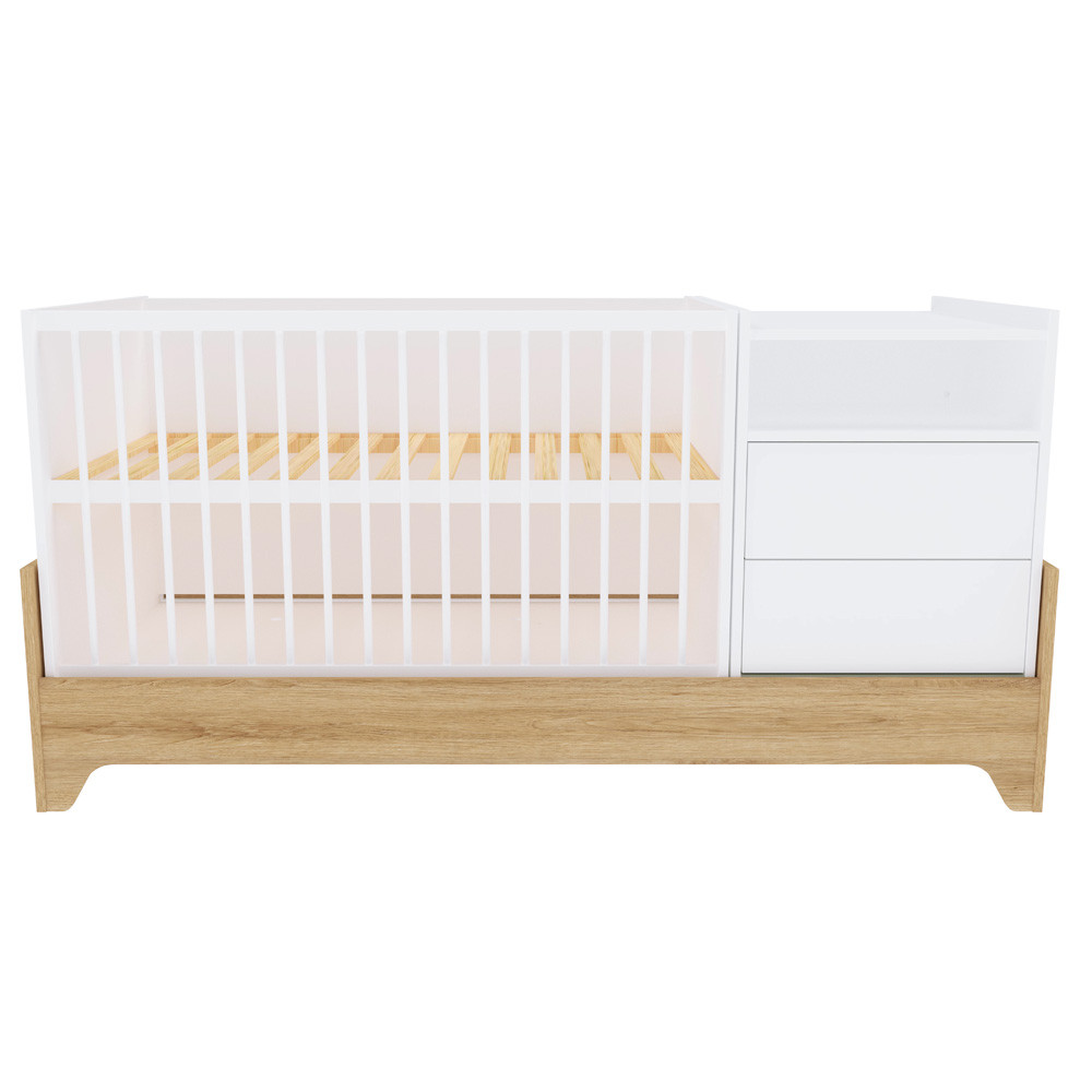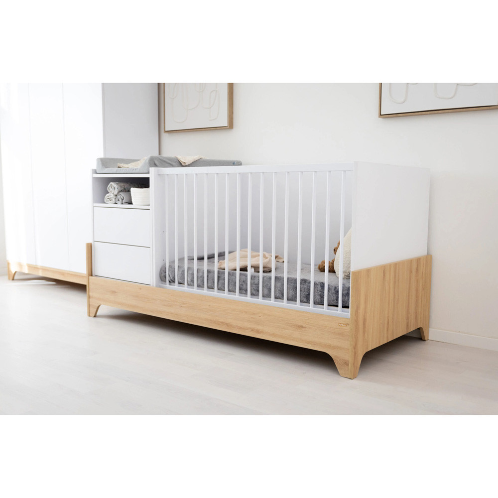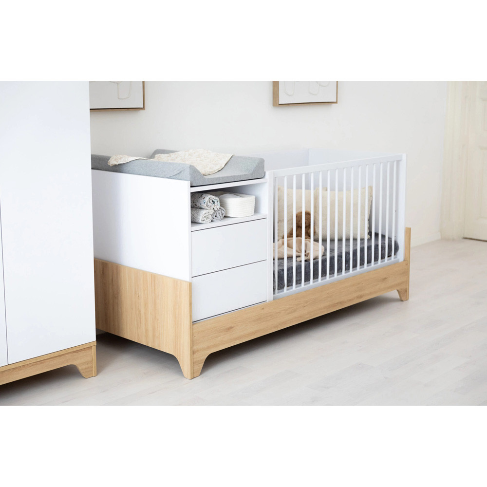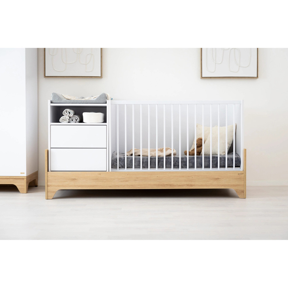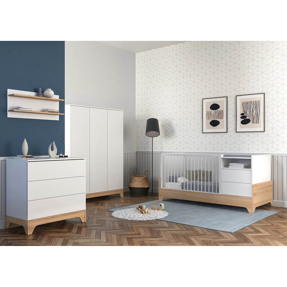Letisztult formavilágával és modern vonalaival a korszerű szülők kedvence, miközben színvilága a fehér és a természetes famintázat harmóniája szinte minden babaszobába tökéletesen illik.