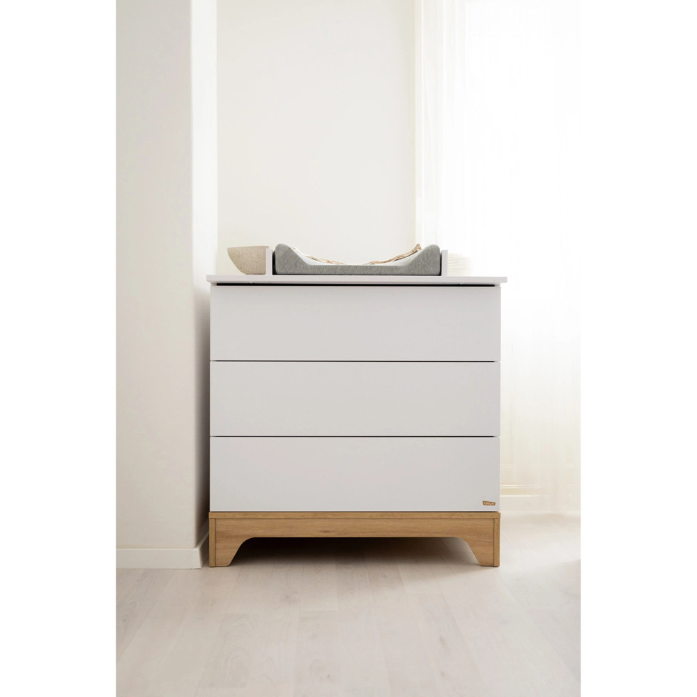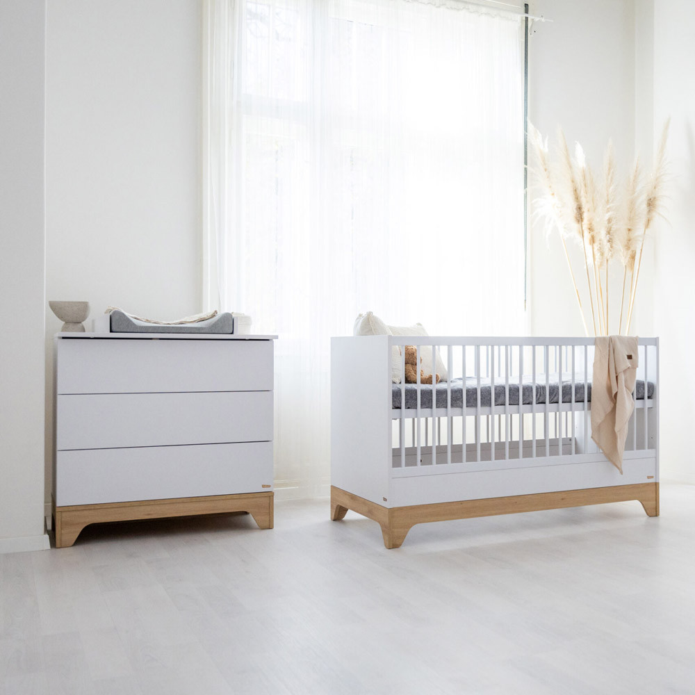 Letisztult formavilágával és modern vonalaival a korszerű szülők kedvence, miközben színvilága a fehér és a természetes famintázat harmóniája szinte minden babaszobába tökéletesen illik.