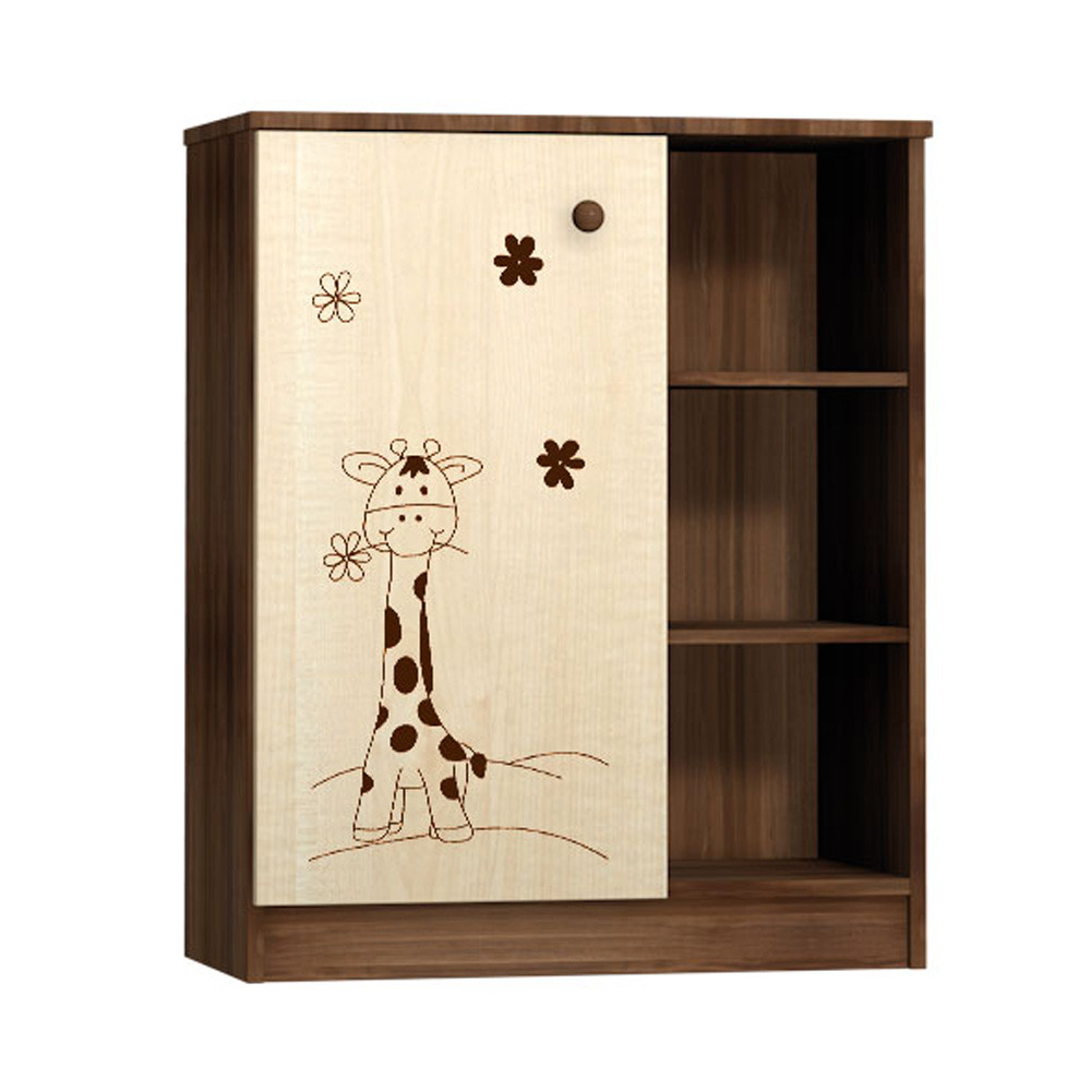 A babaszoba elengedhetetlen eleme. Úgy lett kialakítva, hogy viszonylag kis helyen is elférjen, mégis a lehető legnagyobb segítséget nyújtsa a friss szülőknek. Magassága, pakolófelületei, variálhatósága mind a szülők igényei alapján lettek kialakítva. Nem csak tárolóként funkcionál, hanem egy pelenkázó toldalék vásárlásával pelenkázó komódként használható a komód teteje. És ez még nem minden..A toldalékkal felszerelt komód mögötti üres részre tárolópolcokat lehet helyezni, amivel egy komplett kis szettet lehet összeállítani. A termékre speciális eljárással zsiráf minta kerül elhelyezésre az ajtóra.