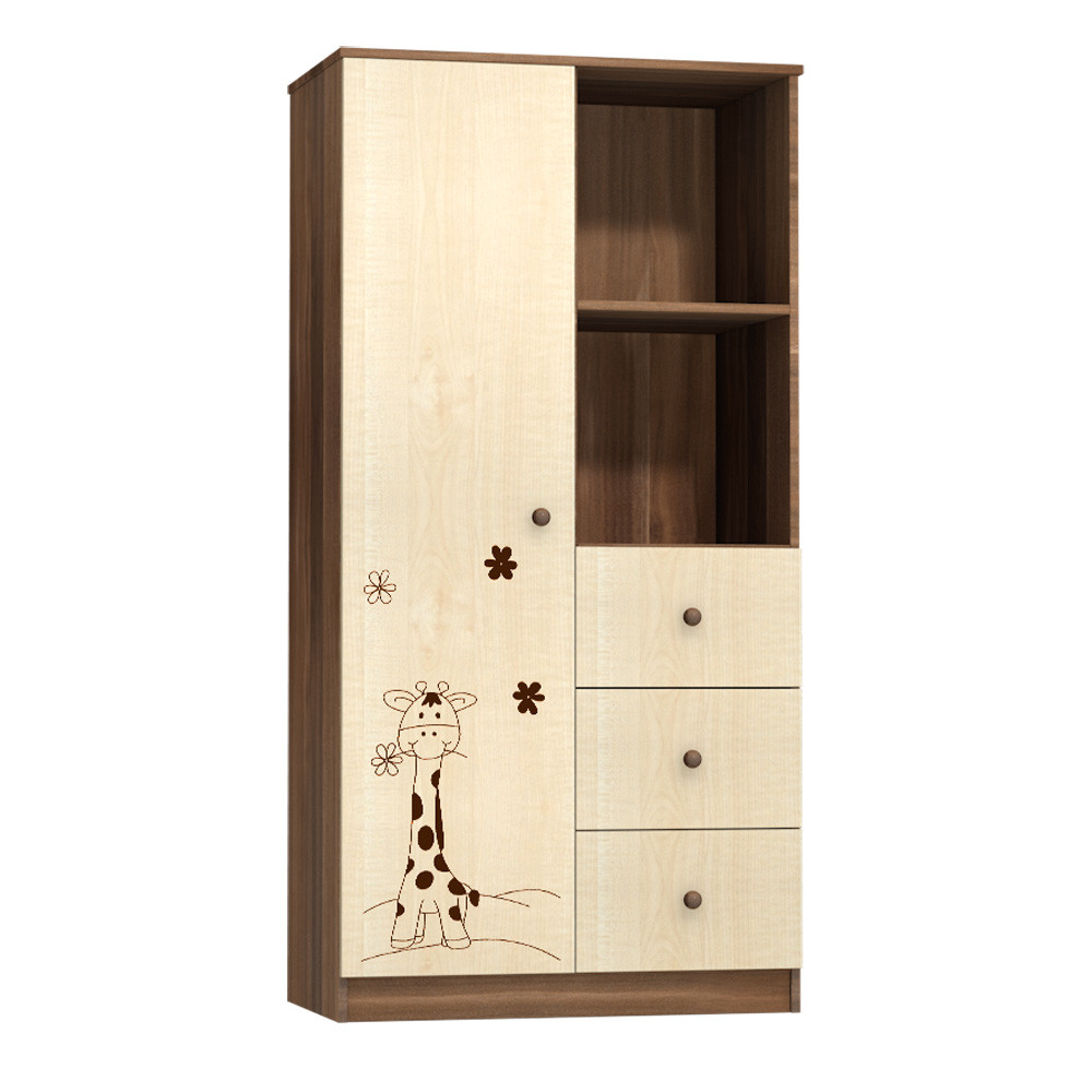 Sokoldalú nagyszekrény különböző tárolókkal. Méretét tekintve ideális kis- és nagyszobákba is egyaránt. Ajtó, fiókok, és nyitott polc is rendelkezésre állnak a tárolásra, így mindennek meg lesz a helye. Kiegészítőként pedig még plusz polcokat is lehet hozzá rendelni. A termékre speciális eljárással zsiráf minta kerül elhelyezésre az ajtóra. A szekrény polcos, illetve akasztós kivitelben is összeszerelhető.