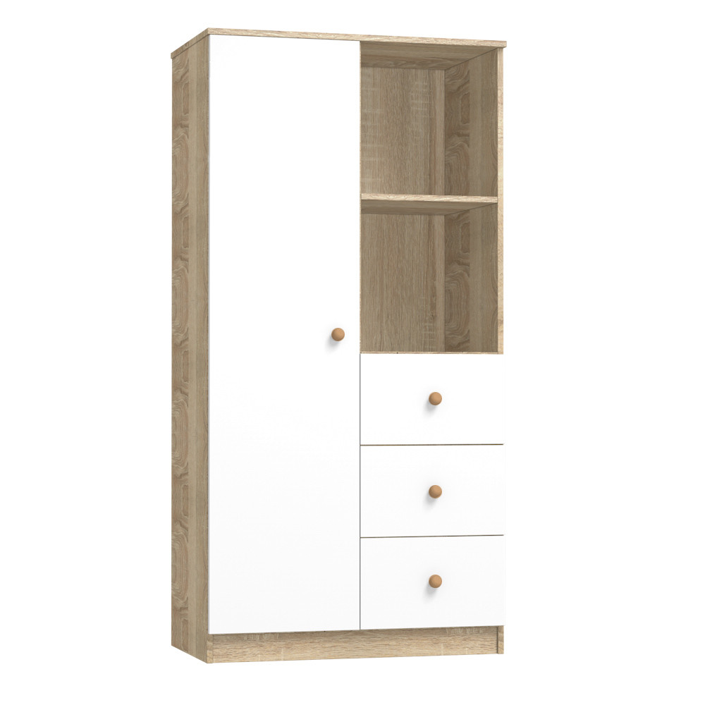 Sokoldalú nagyszekrény különböző tárolókkal. Méretét tekintve ideális kis- és nagyszobákba is egyaránt. Ajtó, fiókok, és nyitott polc is rendelkezésre állnak a tárolásra, így mindennek meg lesz a helye. Kiegészítőként pedig még plusz polcokat is lehet hozzá rendelni.