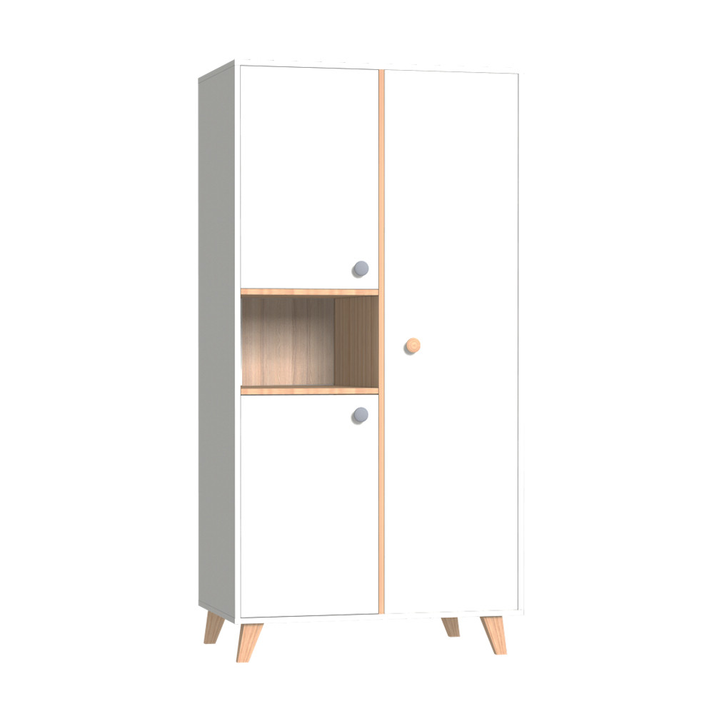 2 ajtós nagyszekrény, mely kiválóan alkalmas a gyermek holmijának tárolására a kezdeti időszaktól kezdve, egészen ifjú korig. Remekül variálható a bútorcsalád többi elemével, melyből a gyermekek számára megunhatatlan gyerekszoba hozható létre. A szekrény belső pakolófelülete igény szerint alakítható akasztós, vagy polcos kivitelűre. Sőt, ha szükséges, plusz polc rendelésére is van lehetőség.