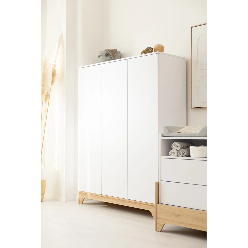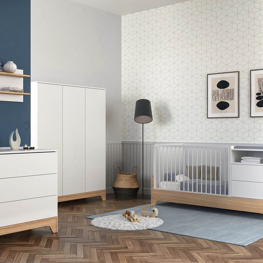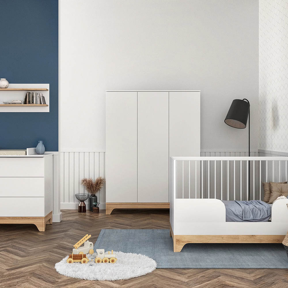 Letisztult formavilágával és modern vonalaival a korszerű szülők kedvence, miközben színvilága a fehér és a természetes famintázat harmóniája szinte minden babaszobába tökéletesen illik.