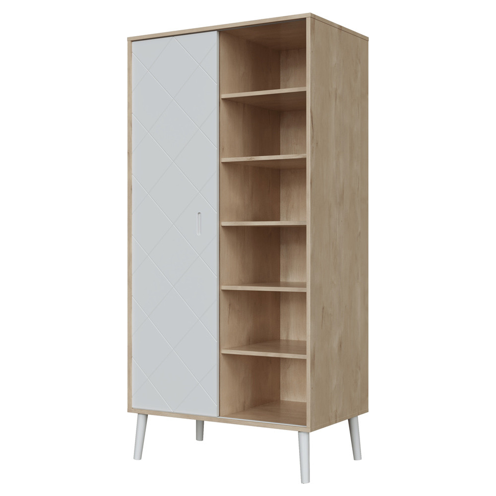 A szekrény polcos, illetve akasztós kivitelben is összeszerelhető. A szekrény bal oldala 1 polcot és 2 akasztó rudat, míg a szekrény jobb oldala 5 polcot tartalmaz.