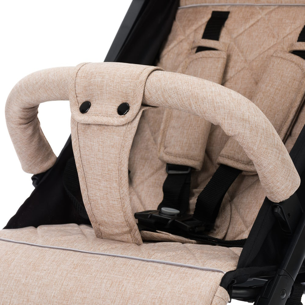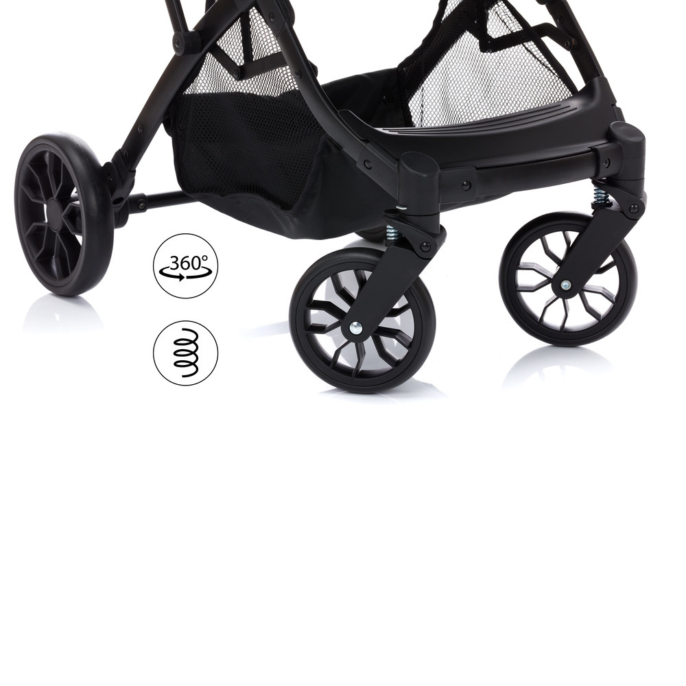 Rugós és 360°-ban elforgatható első kerekeivel, valamint a nagyméretű hátsó kerekeivel minden felületet gond nélkül ural. A 2 pozícióba állítható lábtámasz és a külön állítható háttámla a kicsi igényeihez igazodik. Ha gyermeked séta közben szeretne szunyókálni, a háttámlát fekvő pozícióba, a lábtartót pedig a legfelső helyzetbe állíthatod. Ez kényelmes fekvőfelületet biztosít a gyerkőc számára. A kihúzható tető árnyékot és megfelelő védelmet nyújt a nap és a szél ellen. A párnázott 5 pontos biztonsági övnek és a kivehető első kapaszkodónak köszönhetően a gyermek mindig biztonságban lehet útközben. A séta közbeni megállások során a könnyen működtethető rögzítőfék gondoskodik arról, hogy a babakocsi megbízhatóan megálljon. Ha a babakocsi nincs használatban, egy kézzel gyorsan és egyszerűen összecsukható.