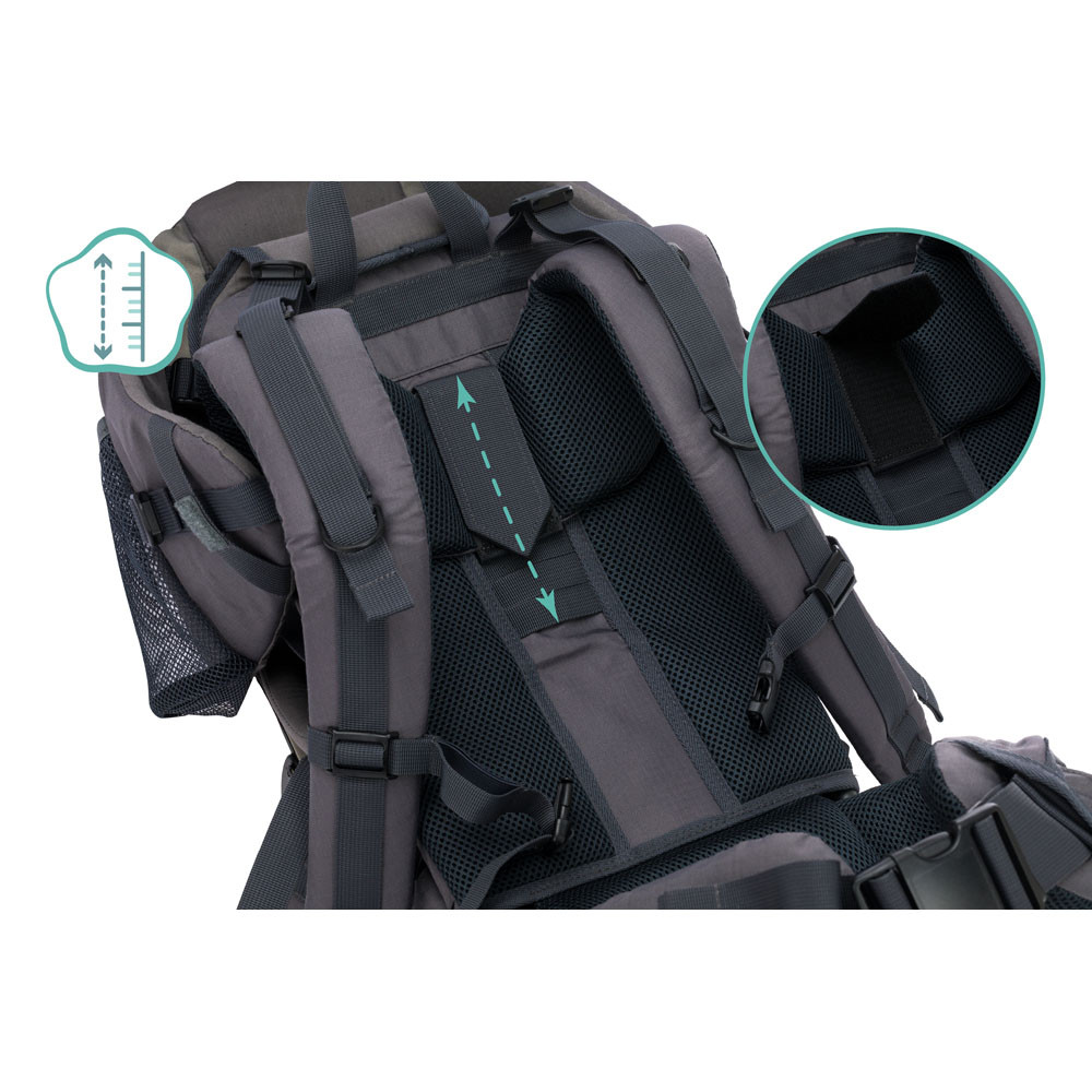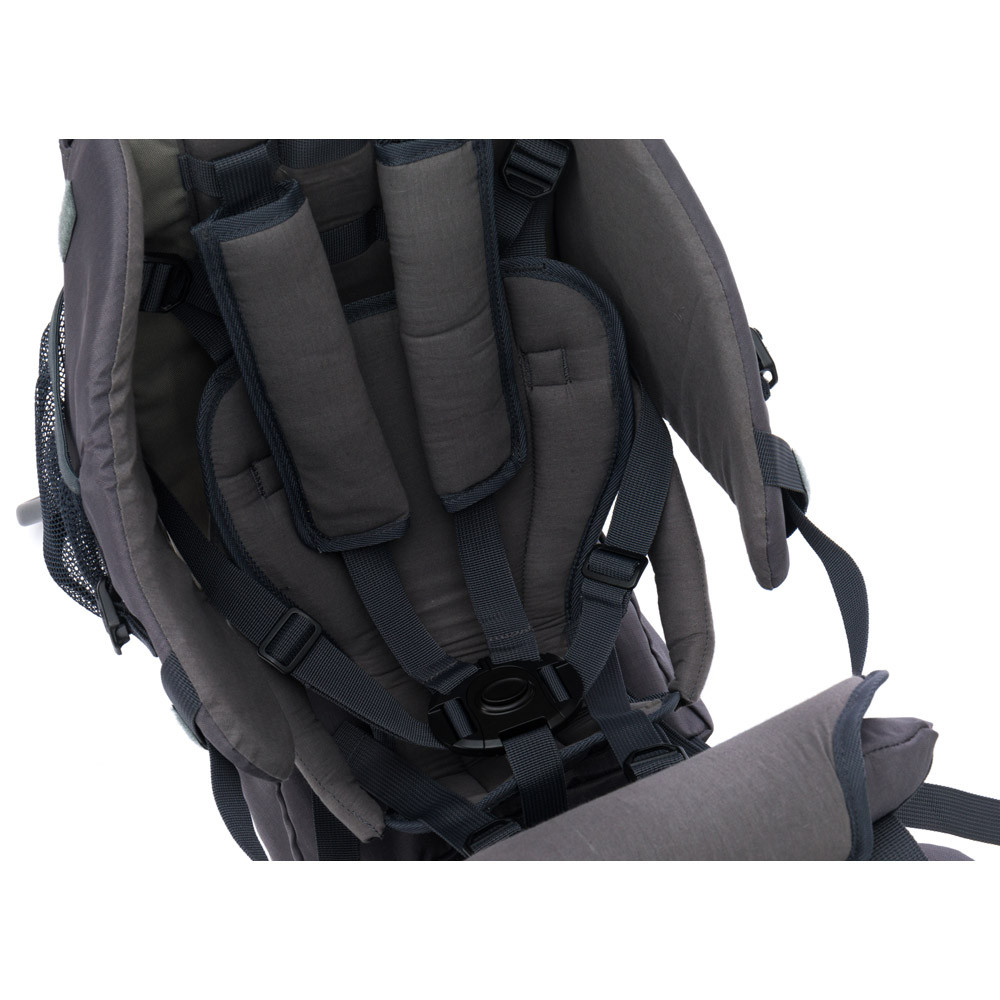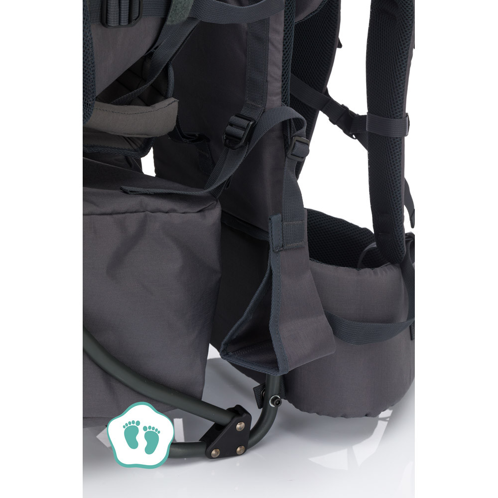 Az ülés puha és kényelmes párnázással van ellátva, míg az összes heveder többfunkciósan állítható. Az Elite hátsó hordozó lábpántokkal is rendelkezik, amelyek optimális könnyítést biztosítanak gyermeke lábának túrázás közben. Ez még nagyobb kényelmet és biztonságot biztosít. A nap- és esőernyő könnyen rögzíthető, és optimális védelmet nyújt minden időjárási körülmény ellen.