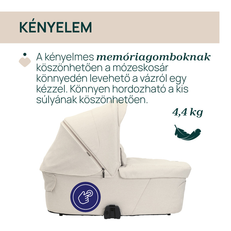 - Köszönhetően a kényelmes memóriagomboknak, a mózeskosár könnyen levehető a vázról egy kézzel.