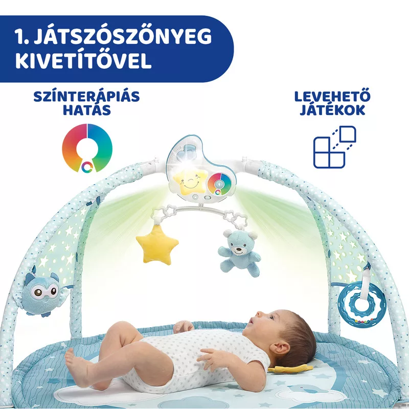 Ez a Chicco Enjoy Colors Playgym játszószőnyeg projektorral és babajátékívvel.
