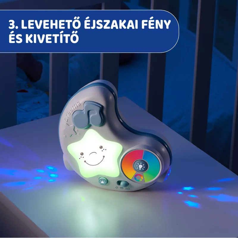 Éjszakai fény - az éjjeli szekrényen: A Félhold alakú eszköz levehető és önállóan is használható. Sima felületre helyezve, például az éjjeliszekrényre, éjjeli fényként funkcionál. A dallamok és a kivetített fényjátékok így elkísérik a babát az elalváshoz is. A középső nagycsillag, az ún. csillagfény szolgál éjszakai fényként. A be- vagy kikapcsolásához a csillag alatt lévő gombot kell megnyomni. Ez a csillagfény akkor is működik a bekapcsolása után, ha a 15/30 perces zenés-fényes lejátszást nem kapcsoljuk be.