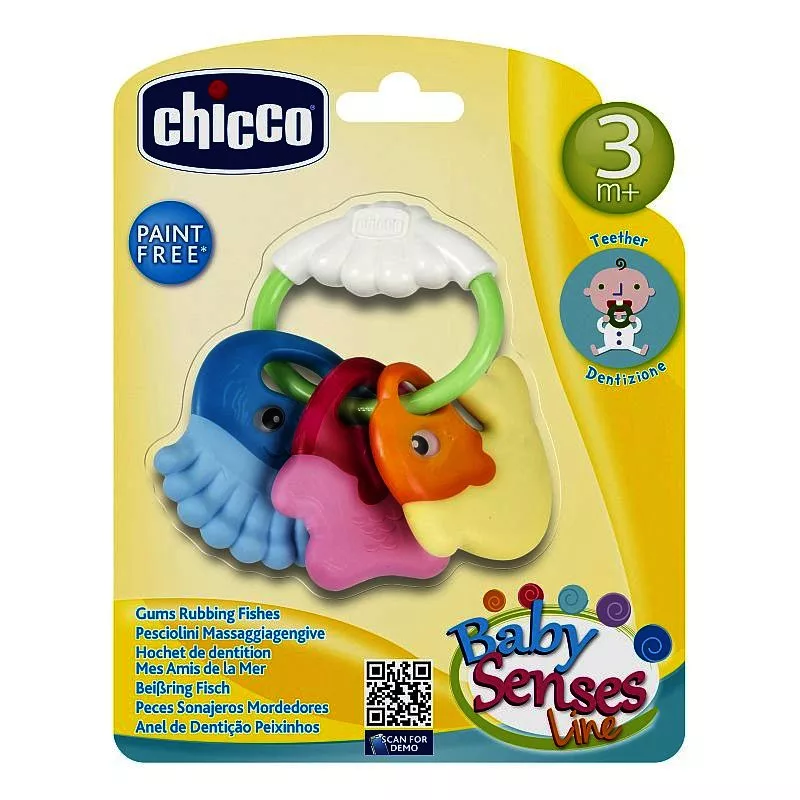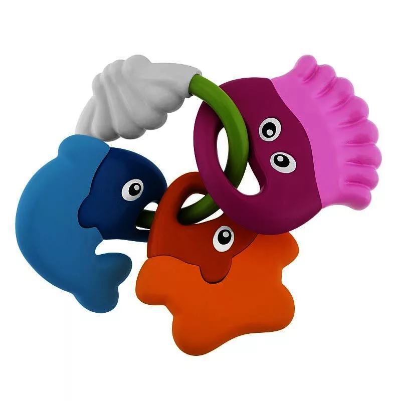Ideális a fogzási időszakban. A puha felületű műanyag csörgő játékok rágókás szélekkel vannak ellátva. A babakézre tervezett fogása révén jól rázható. Ez a játék elbűvöli a csecsemőt, rázza és rázza, majd szájába véve rágja, ami enyhíti a fogíny fájdalmakat a fogzás idején. A karikás rész nem nyitható szét, tehát babakocsira, kiságyra nem rögzíthető ily módon.