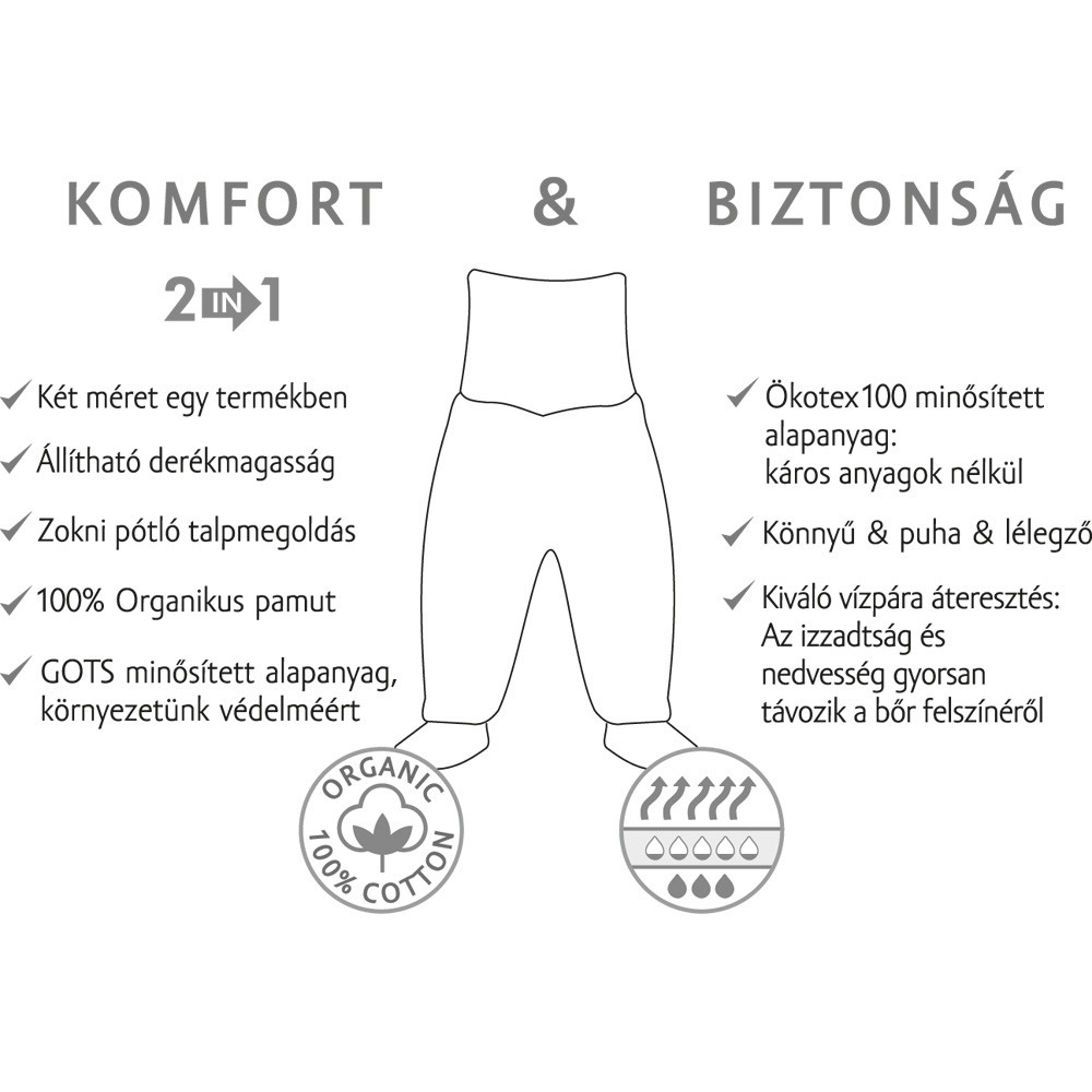 • Fazon: Talpas pamut nadrág, állítható magasságú derék – passzéval