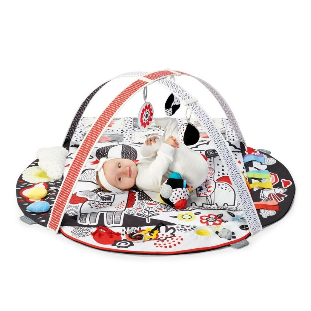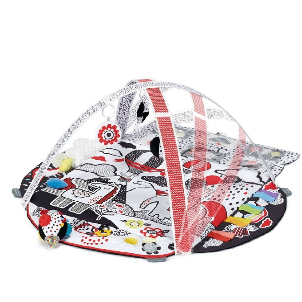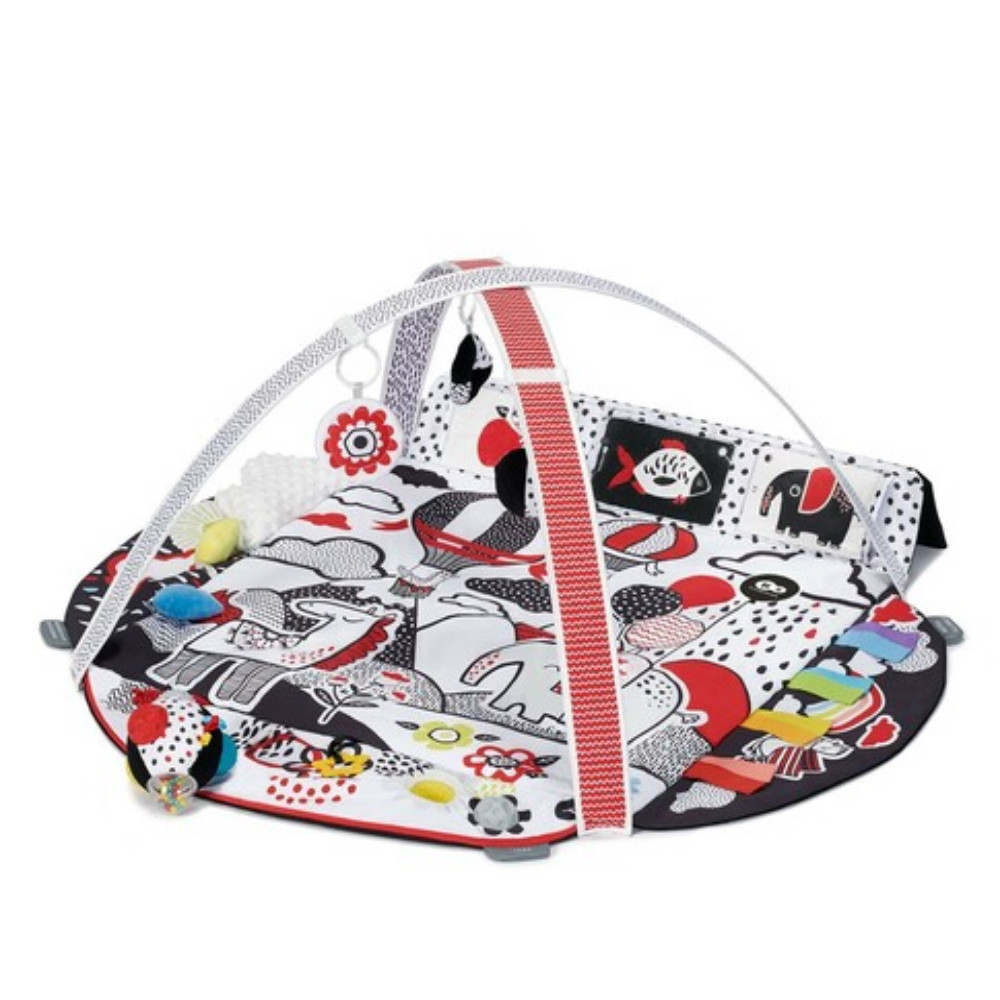 A szettben található kártyákat egy speciális műanyag zsebbe lehet tenni a szőnyeg oldalán. Különböző formákat mutatnak és kontrasztosak. A szőnyeg oldala felemelhető, hogy arra ösztönözze kisgyermekét, hogy emelje fel a fejét és edzze a nyakizmait.