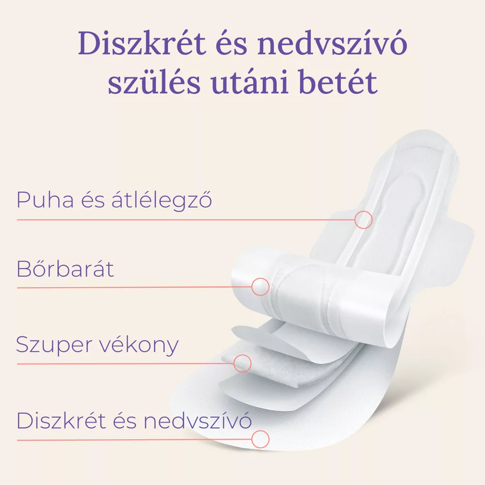 Szülés utáni második héttől, akár a teljes gyermekágyas időszak alatt (6 hét) használd az erre az időszakra kifejlesztett, a kisebb mennyiségű gyermekágyi váladék, a lochia felfogására szolgáló betétet.