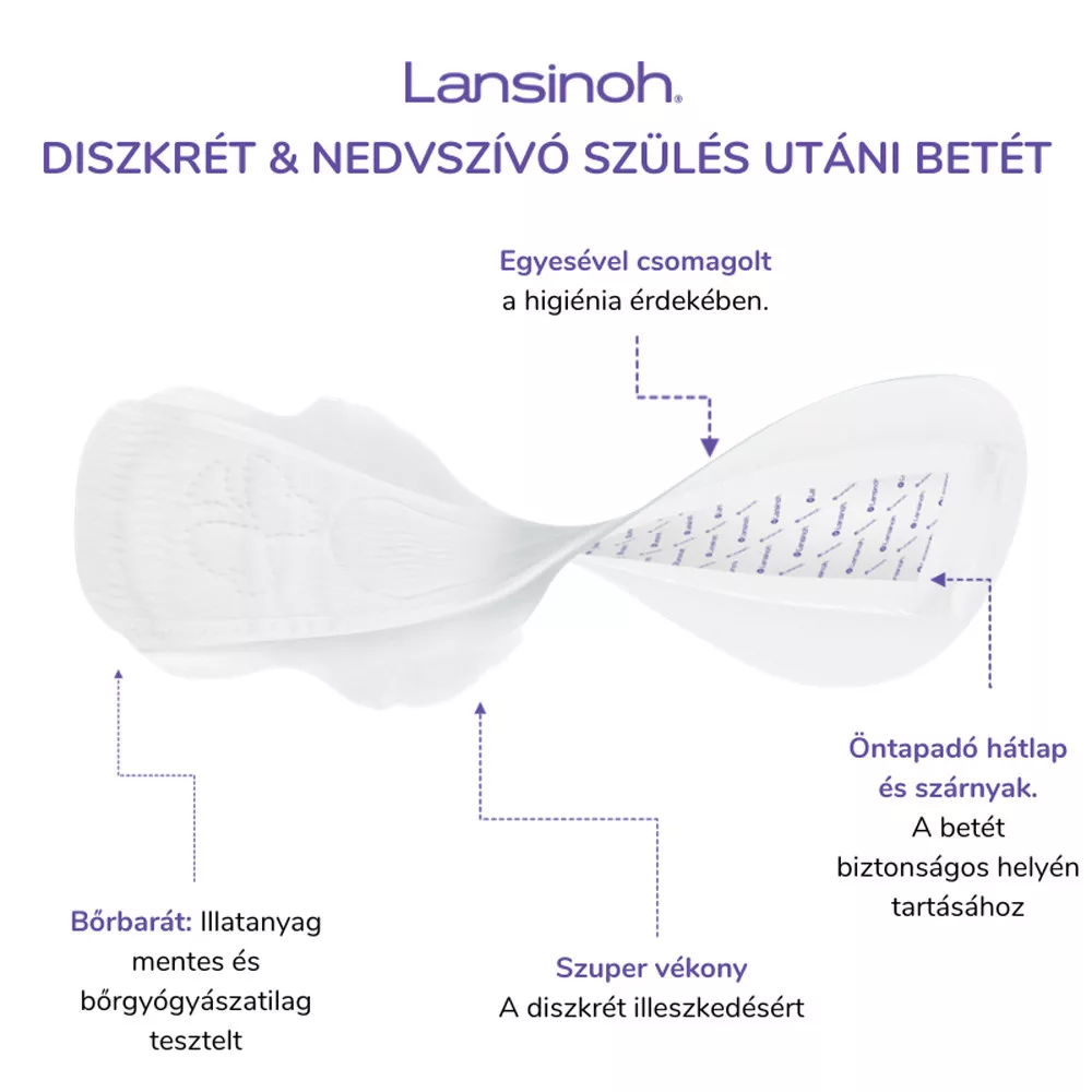 • A Lansinoh diszkrét és nedvszívó szülés utáni betét szuper vékony, átlélegző, szárazon tartó, puha és selymes, nem dörzsöli az érzékeny gáttájékot.