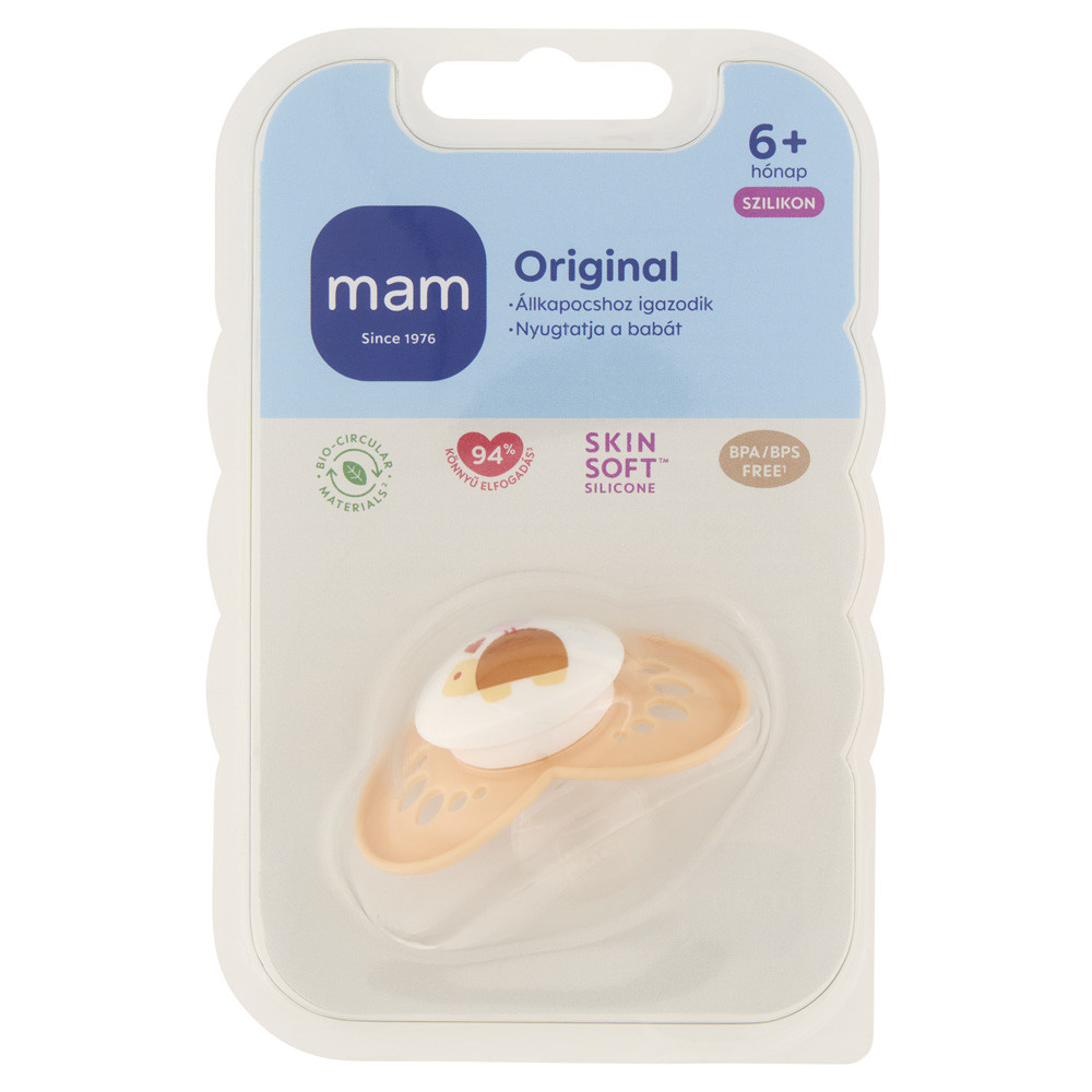 MAM SkinSoft szilikon szívóka, amely a bőrhöz hasonló, ismerős érzést nyújt és a babák 94%-a elfogadja (piackutatás 2010-2018, 1383 babával tesztelve).