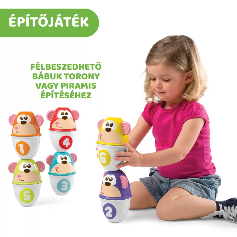 Az első tekejáték, amellyel a gyermek jól szórakozhat, miközben megpróbál eltalálni 6 vidám, színes bábot egy labdával, amelyek mindegyikén majomarc látható.