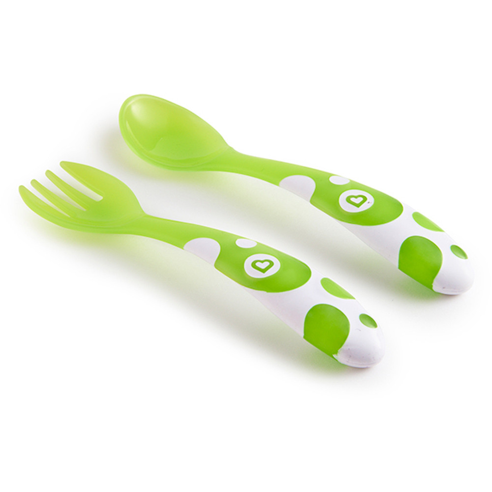 • Biztonságos villák: Az ívelt villák lekerekített formájúak, így biztonságosan tudjuk a kicsiket az „igazi” evőeszközökre való áttérésben segíteni.