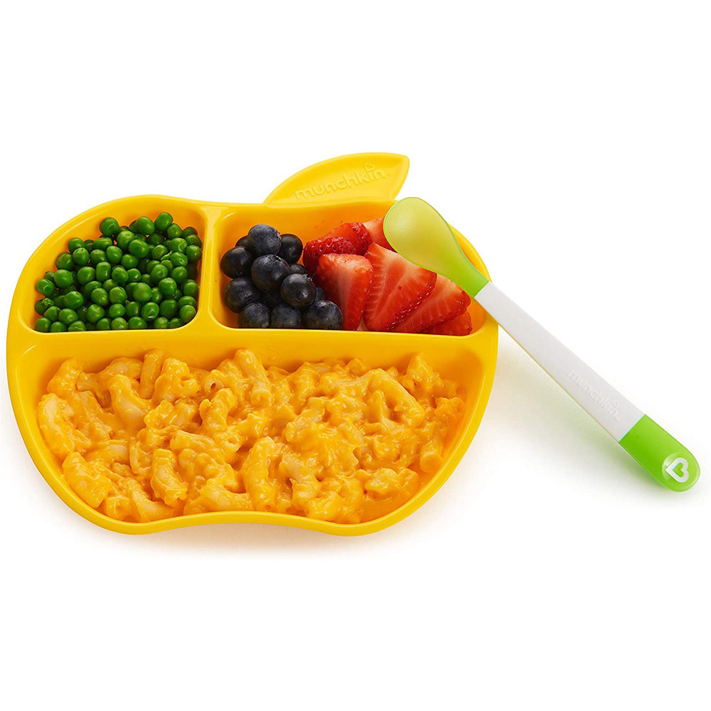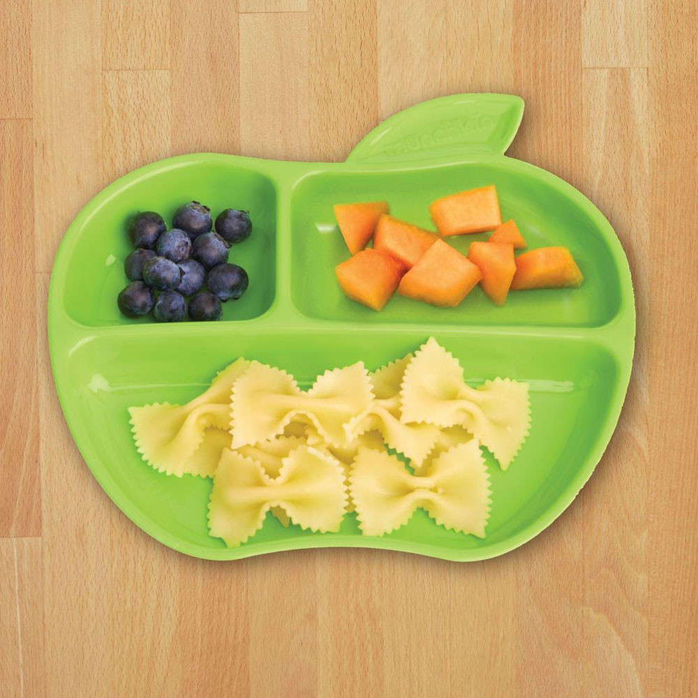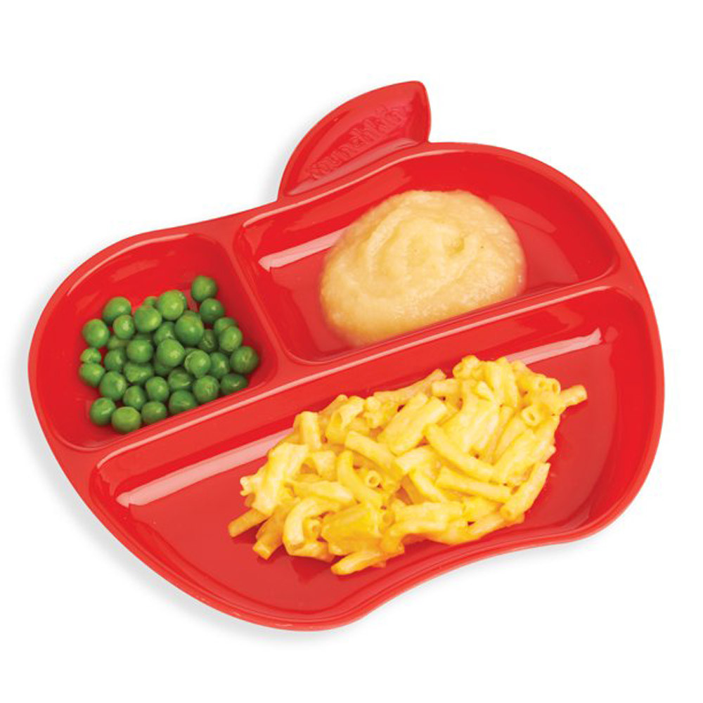 A Munchkin Apple rekeszes tányérok ideálisak a különböző ételek fogyasztását tanuló kisgyermekek számára.A három részből álló, aranyos alma alakú tányér legnagyobb részéből a kisgyermek könnyedén kikanalazhatja az ételt, míg a kis részek ideálisak pl. mártogatáshoz, kockázott zöldség vagy gyümölcs szervírozásához.