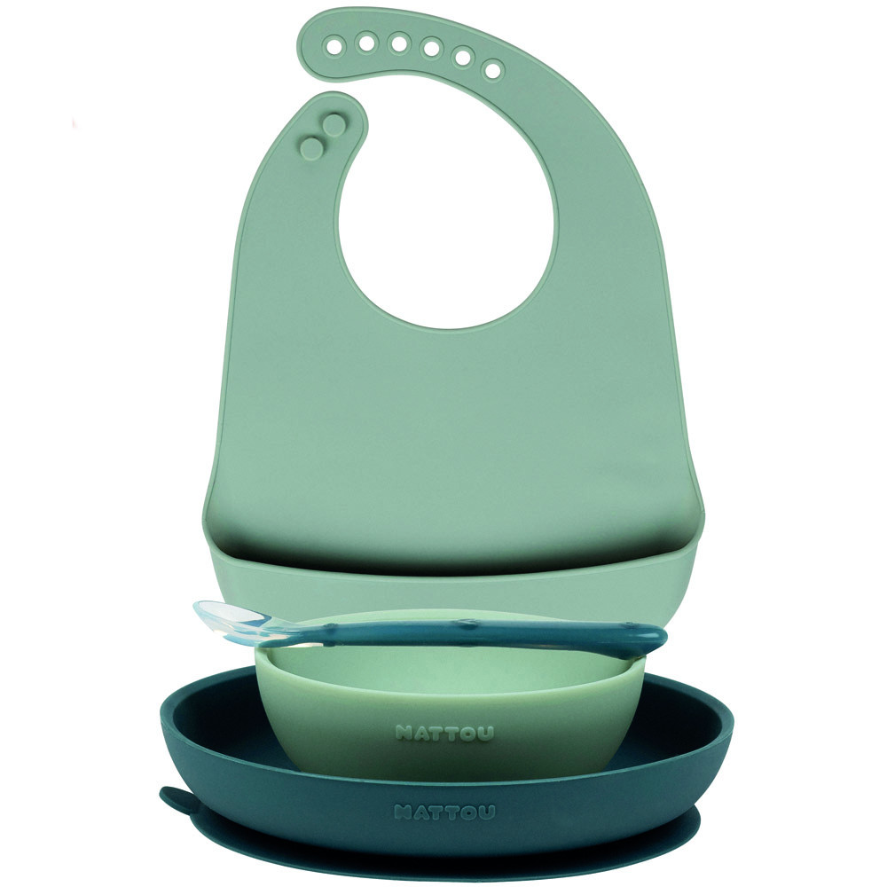 A Nattou négyrészes, puha szilikonból készült étkészlete nagyon praktikus, könnyen megfogható és csúszásgátlós. A tálak lekerekített belső szélei megkönnyítik az ételek felvételét.