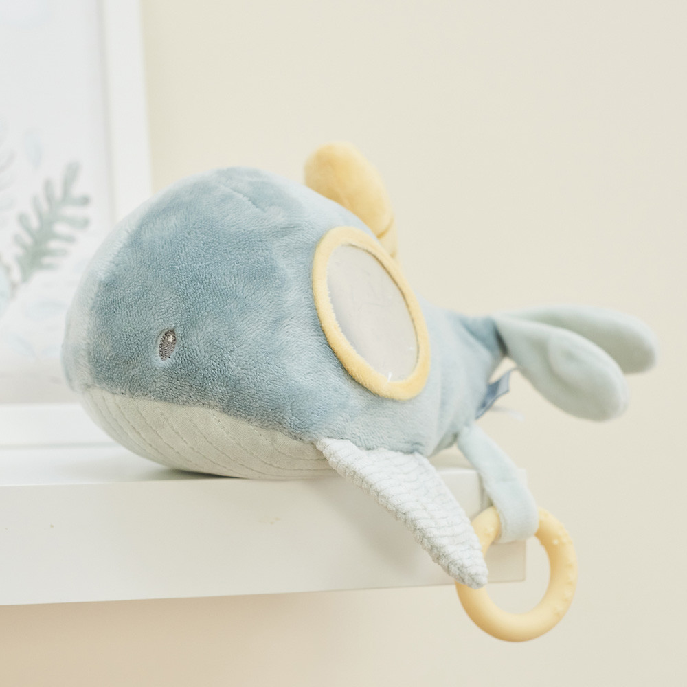 A bálnának több szórakoztató tevékenysége van: zörgés-csikorgás-papírropogás és különféle megfogási lehetőségeket lehet felfedezni. A különösen puha anyagok és a különböző textúrák serkentik a tapintóérzék fejlődését és felfedezésre hívnak. A könnyen megfogható elemek ideális társsá teszik a kedves bújós játékot babák és újszülöttek számára.