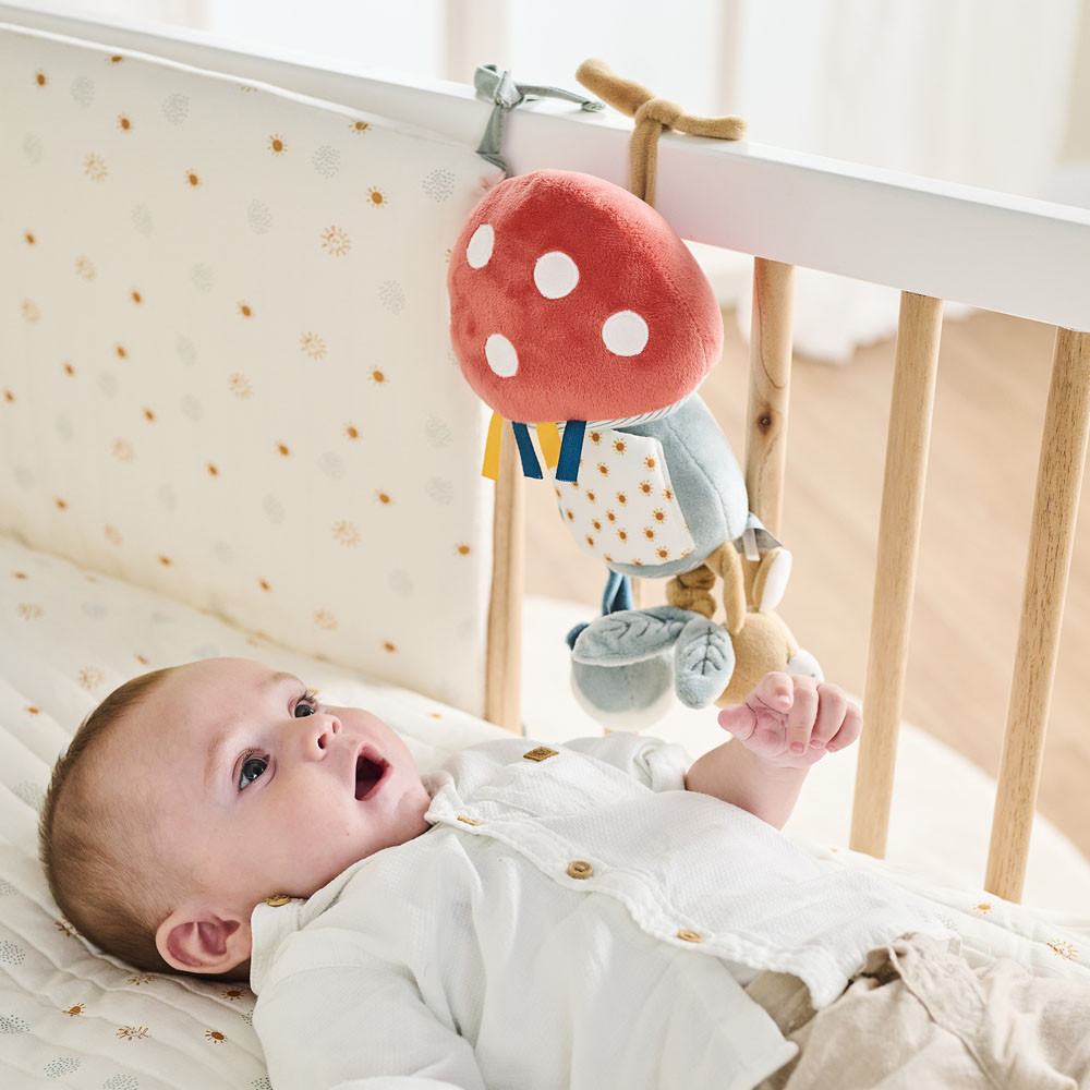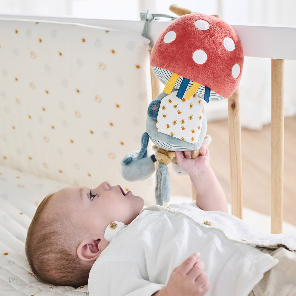 Ez a gyönyörű gomba formájú bújós játék különféle játékokkal több órányi játékidőt biztosít a babának! Az olyan szórakoztató tevékenységek, mint a Felix róka bújós játék sípolóval, a Leo szamár bújójáték csörgővel, a rezgő gomba csengővel, tükör és számos címke arra ösztönzi a babát, hogy felfedezze és megragadja a játékokat. Ily módon játékon keresztül serkentik gyermeke megfogási reflexeit és motoros fejlődését. A gomba puhasága biztonságos és megnyugtató érzést nyújt. Hűséges játéktárs, amely születéstől fogva örömet és kényelmet hoz, valamint remek ajándékötlet a baba számára.