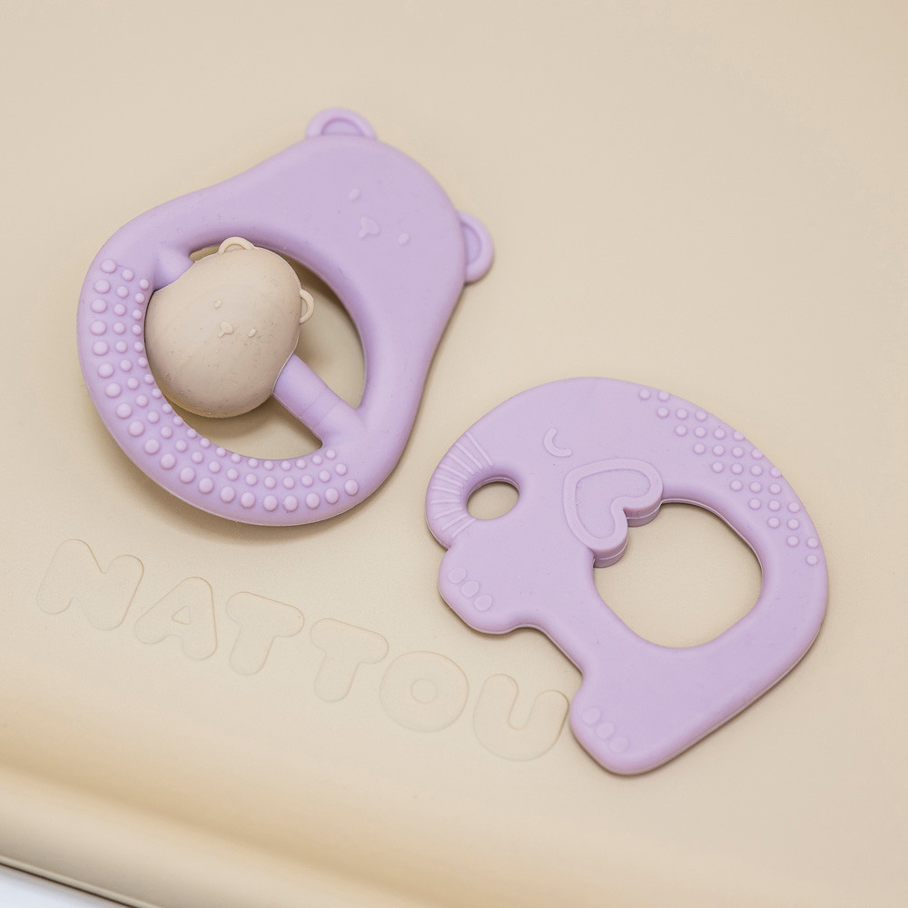 - szilikon rágóka texturált felülettel az íny masszírozására és a fájdalom enyhítésére