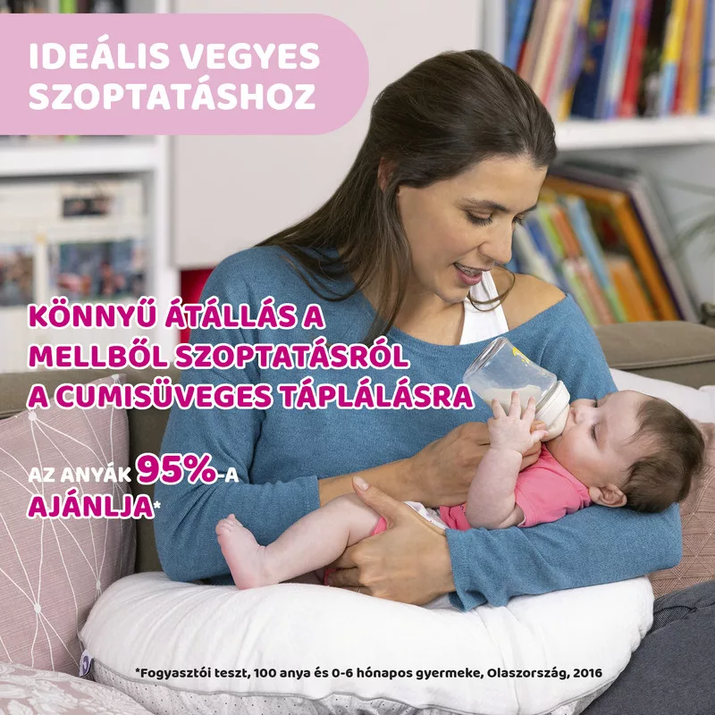 A Chicco NaturalFeeling az egyetlen cumisüvegcsalád, mely többféle formájú etetőcumival rendelkezik, a baba szopási képességének fejlődését követve. Minden etetőcumi dupla-hasfájásgátló-szeleppel ellátott.