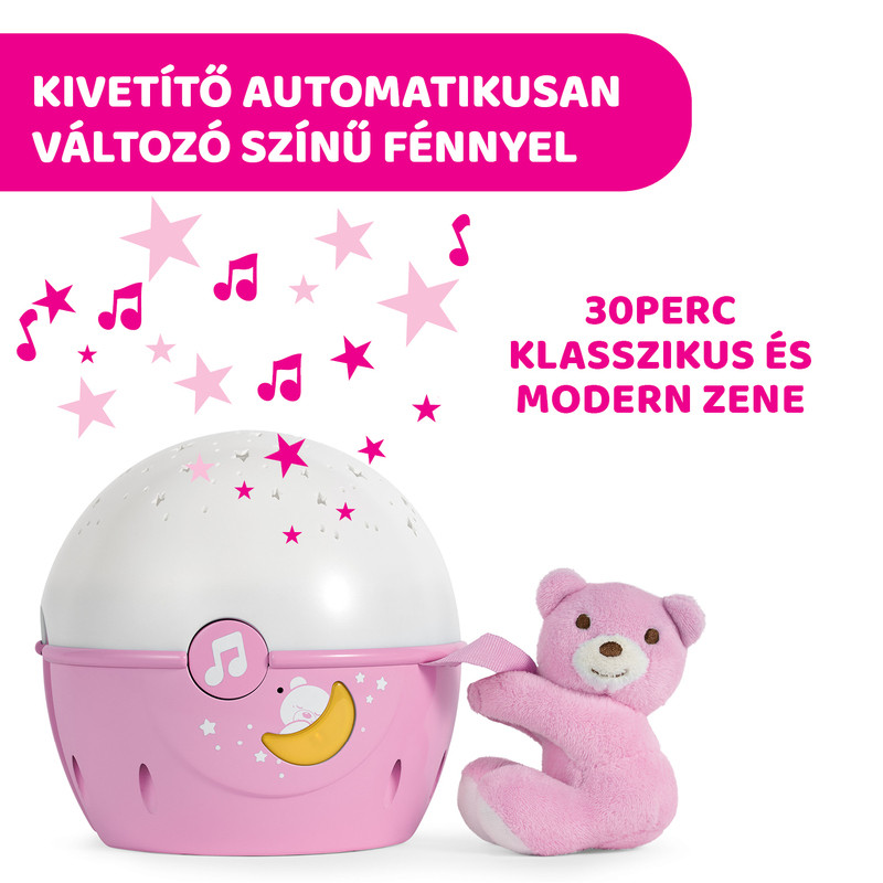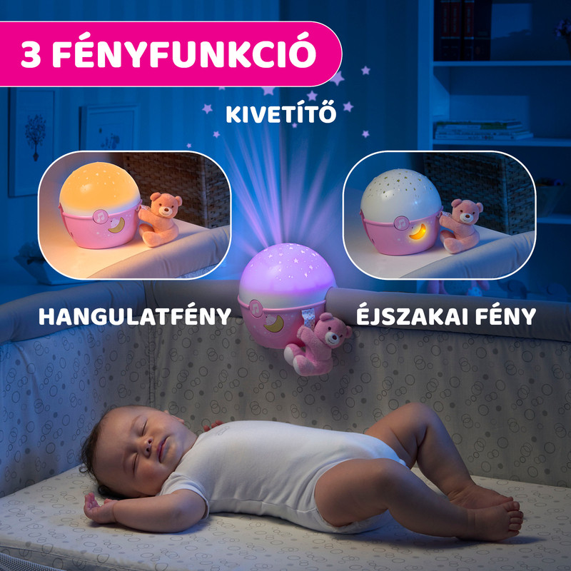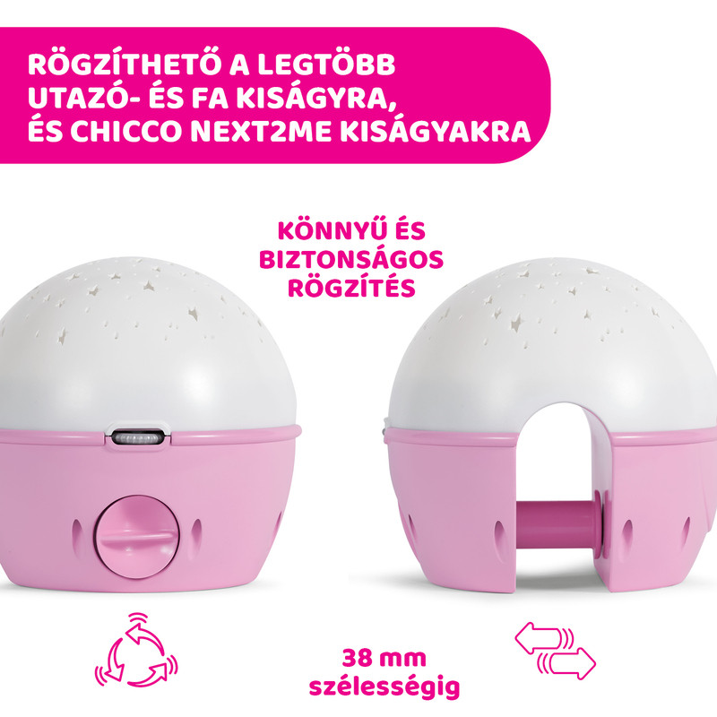 A projektor rögzíthető a Chicco NEXT2ME babaágyra, ill. nagyon sok egyéb kiságyra (max. 3,8 cm peremszélességig). A projektor éjszakai fényként és normál kislámpaként is használható. A baba hangjára bekapcsol és 30 percen át képes zenélni, világítani. A projektor fejleszti a muzikalitást.