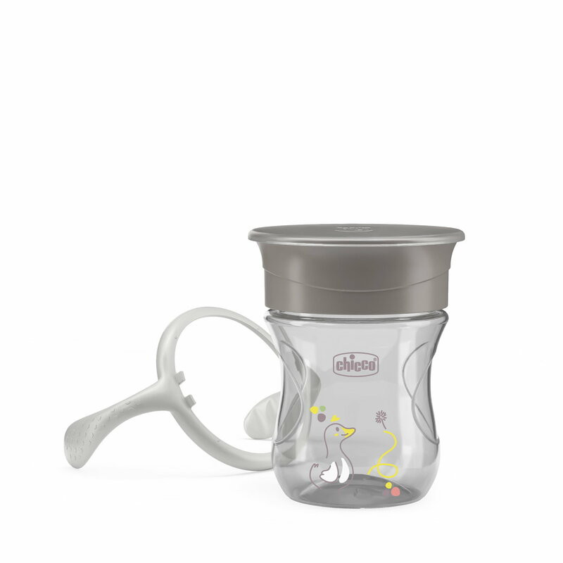 Kifolyás-biztos ivópohár, a pohárból ivás gyakorlásához. Ez a pohár 360° fokban körbeforgatva sem csepeg, miközben a gyermek úgy ihat belőle, mintha egy hagyományos normál pohárból inna.