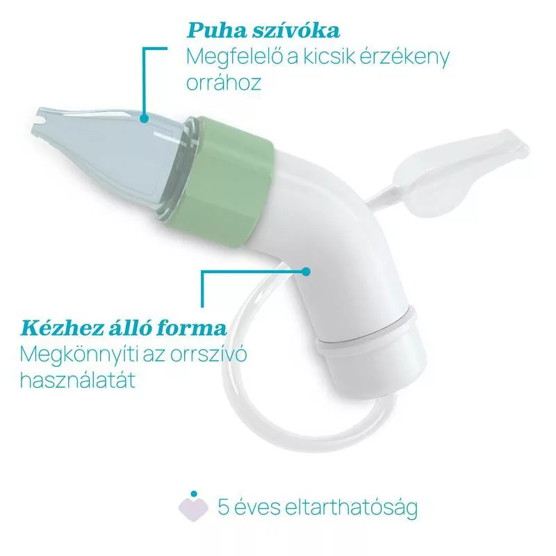 HASZNÁLAT: A puha, rugalmas, szilikon orrkanült, benne a szűrővel, a baba orrába dugjuk. A szívósípot megszívjuk.