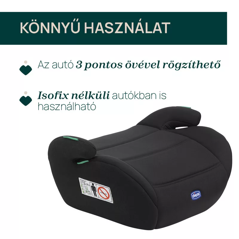 Használat: akár már 126 cm testmagasságtól használható, de balesetbiztonsági okból inkább a 135 cm-től való használat a javasolt. Mivel az ülésmagasítók nincsenek ellátva a fej és a felsőtörzs oldalvédelmével, ezért csak akkor tanácsoljuk a használatukat, amikor az utasbiztonsági gyerekülés már tényleg nem kényelmes a gyereknek, mert kinőtte.