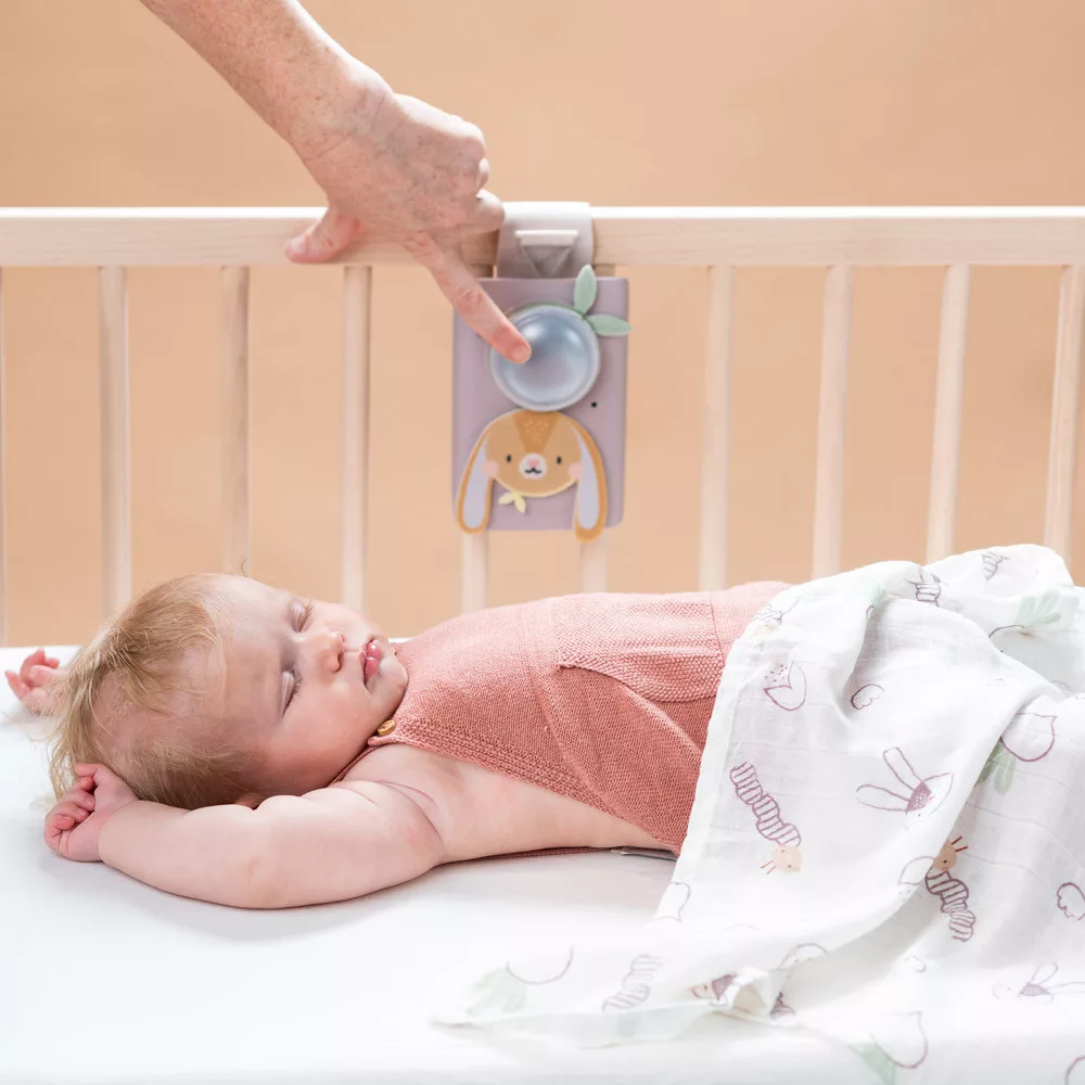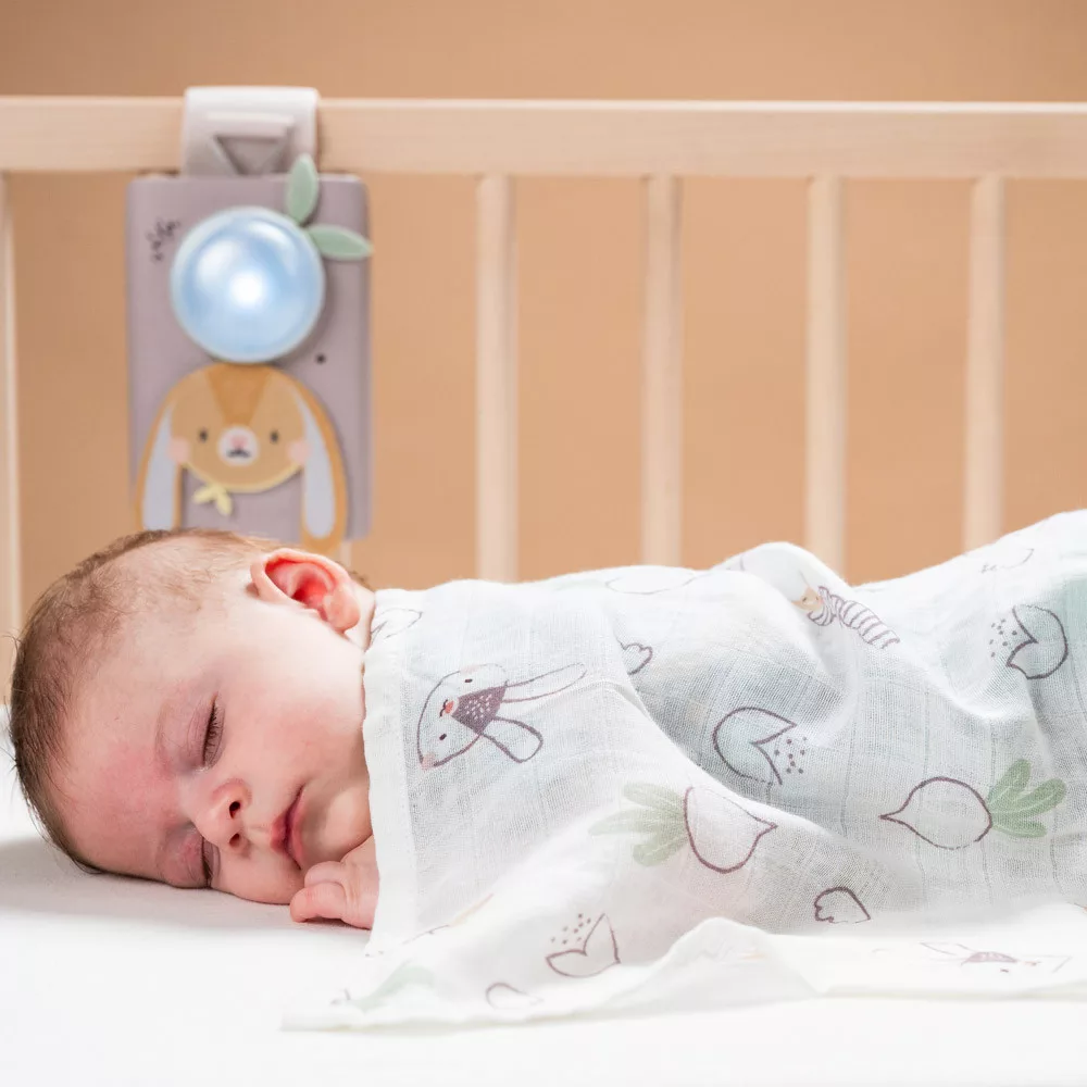 A nyugtató nyuszis Taf Toys készlet egy hangra aktiválódó zenélő éjjeli fényből és egy prémium minőségű vékony takaróból áll, amely 70% bambusz és 30% pamut luxus keverékéből készült.