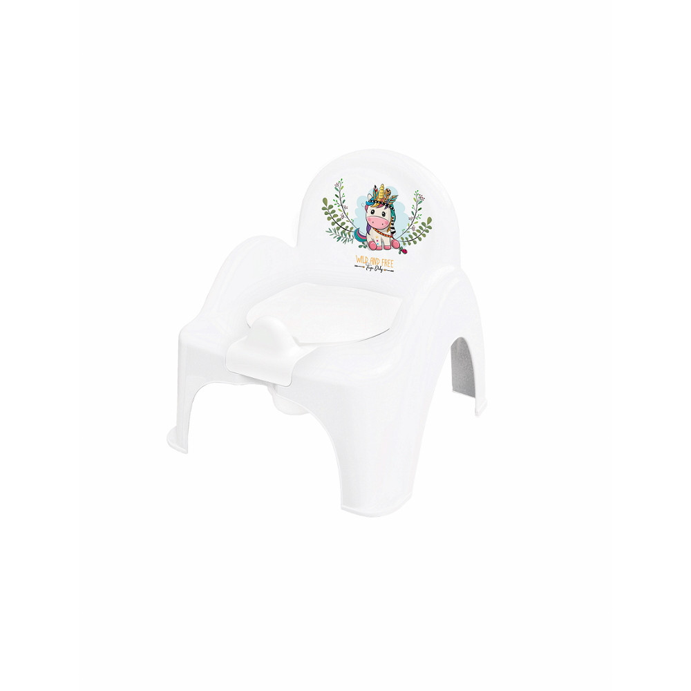 Magas háttámlával, kivehető betéttel és lehajtható fedéllel rendelkező, csúszásgátlós bili.