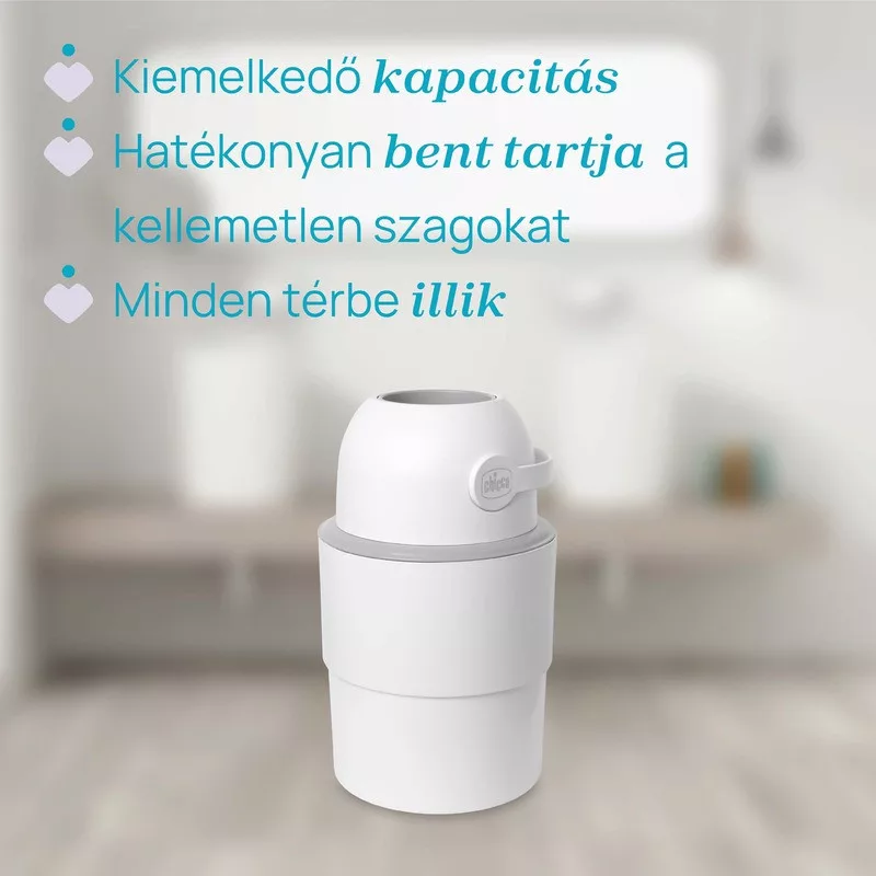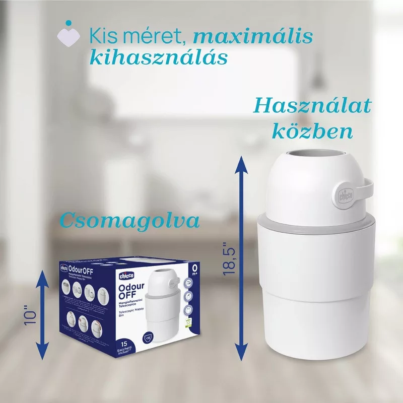 Használható hagyományos műanyag zacskókkal vagy az ODOUR OFF Chicco zacskókkal, melyek mérete tökéletesen illeszkedik a pelenkatartó belső kapacitásához.