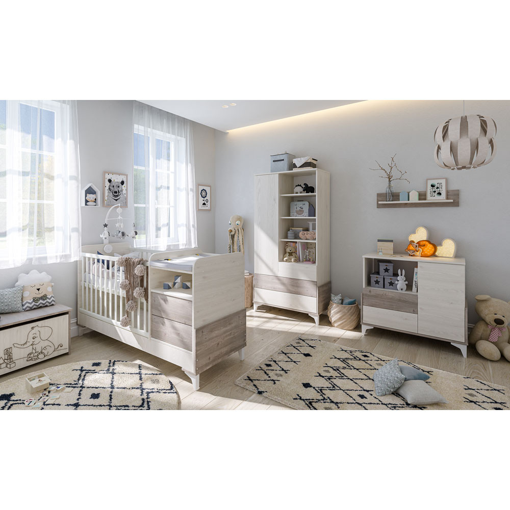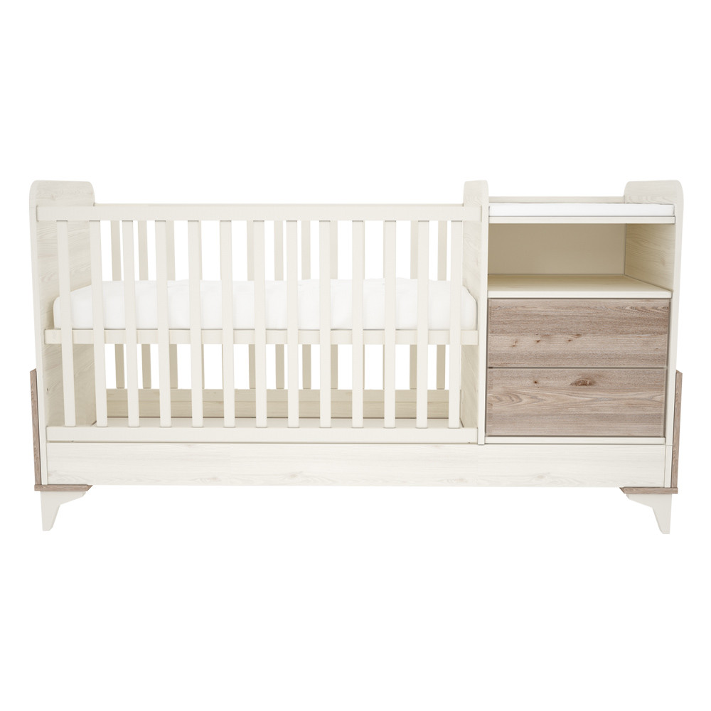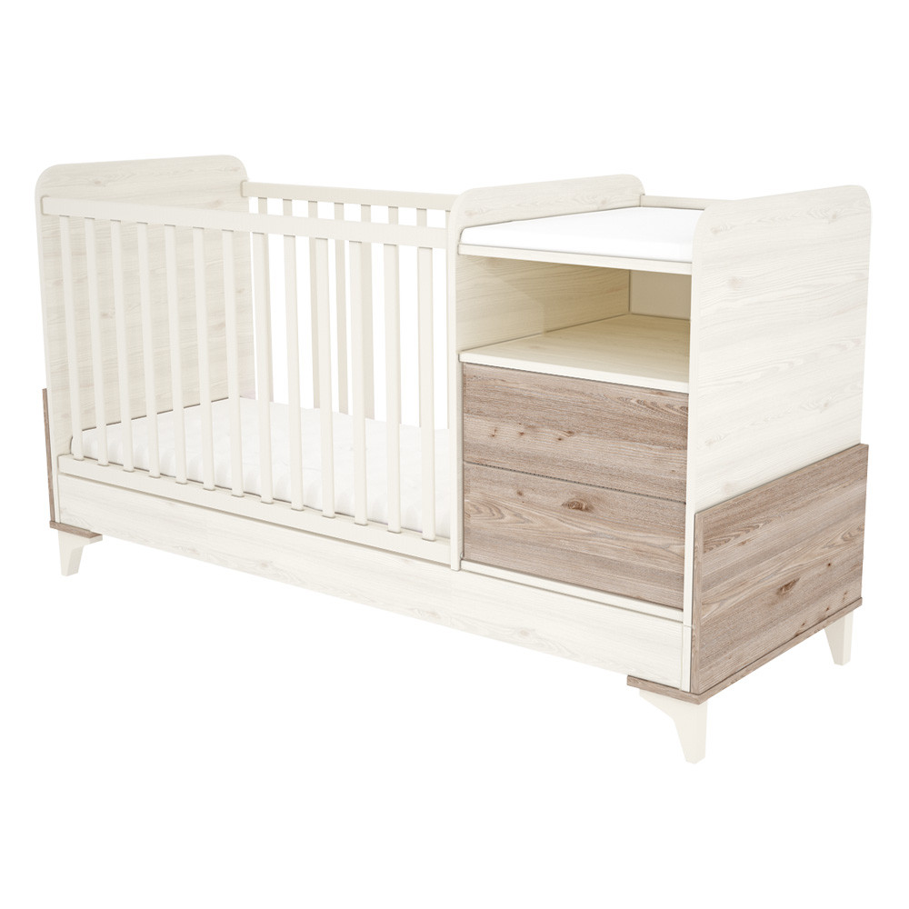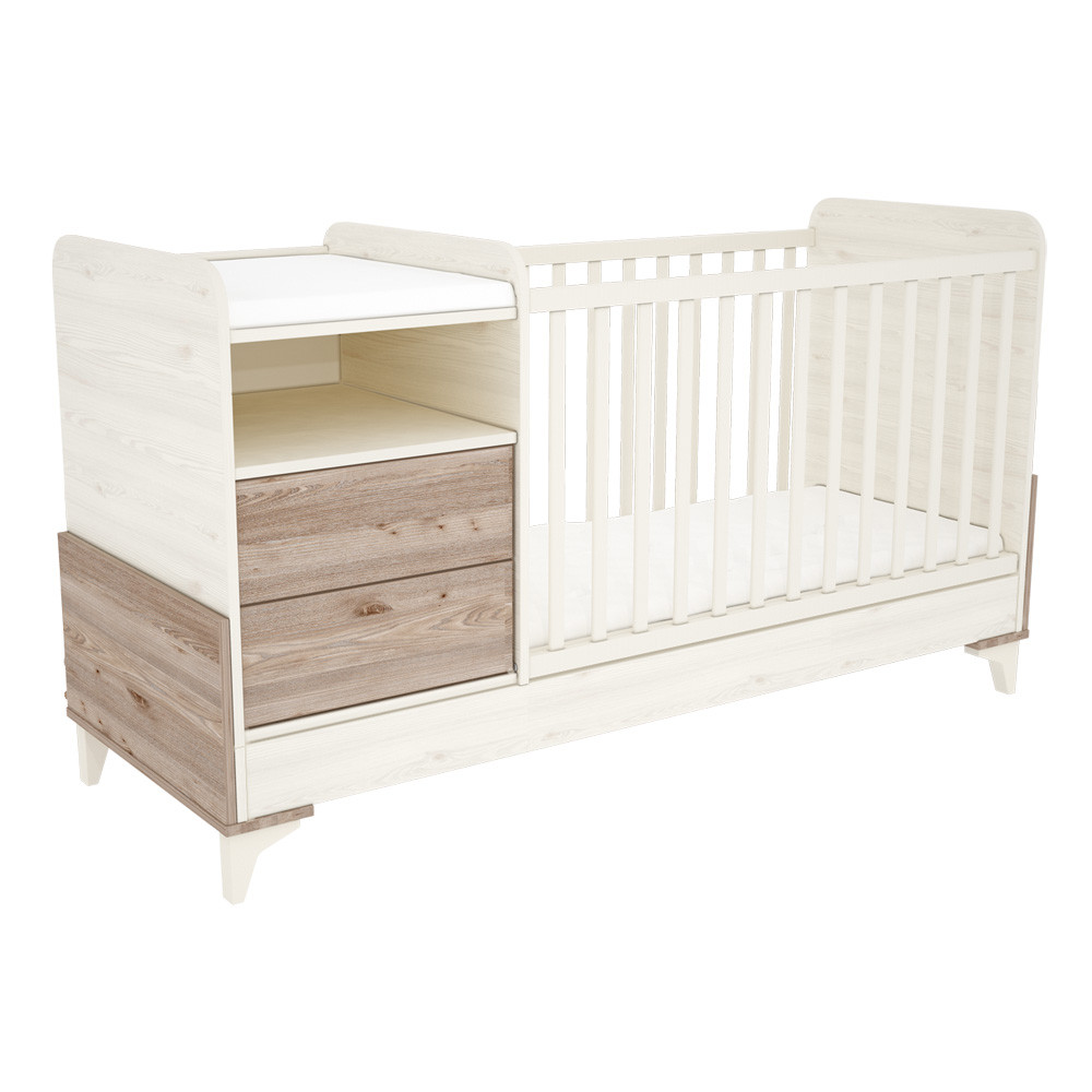 Kombinált kiságyunk megfelelő választás kisebb babaszobák berendezése során, hiszen kombinálja a klasszikus rácsos kiságyat a pelenkázószekrénnyel, ám jóval kisebb helyet foglal el, mint a két bútordarab külön-külön. A kiságyon a pelenkázószekrény a szobához alkalmazkodva jobb és bal oldalra egyaránt felszerelhető. A terméken található fiókok nem rendelkeznek fogantyúkkal mivel nyomásra nyílnak és záródnak.