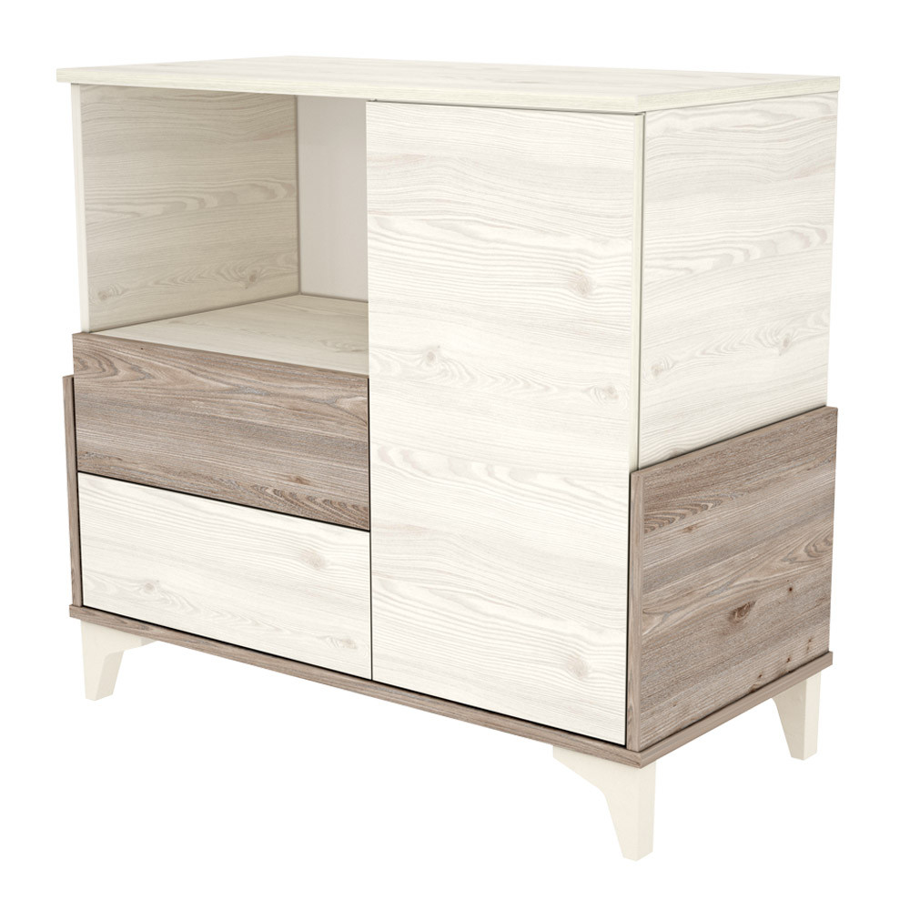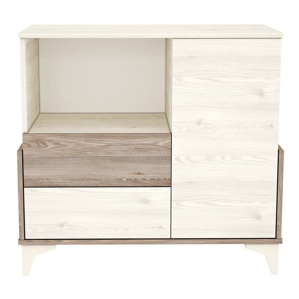 kínálatunknak. A szekrény rendelkezik egy könnyen pakolható nyitott résszel, egy ajtóval elfedett polcos résszel és két fiókkal. Ez a sokszínű kialakítása teszi a szekrényt jól kihasználhatóvá, remekül