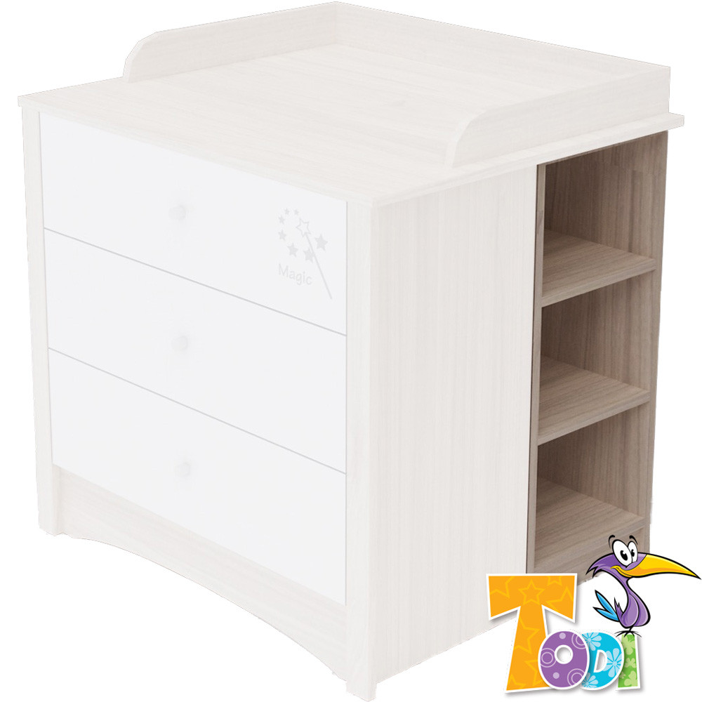 A Magic elegáns, klasszikus megjelenésű termékcsalád, amely szupermatt felületű, fahatású bútortesttel és magasfényű fehér fronttal rendelkezik. A Magic nyitott polc a pelenkázó toldalék alá, egy praktikus megoldás a pelenkázásnál. Polcai segítik a pelenkázáshoz szükséges dolgok pl. krémek, popsitörlők tárolását, így azok könnyen átláthatóvá, rendszerezhetővé válnak. Akár a komód mögé, mindkét oldalra beszerezhető egy-egy nyitott polc, így megnövelhetjük a tárolóhelyek számát. Polcai nem kivehetőek, így a gyermeke nem tudja magára rántani a rajta elhelyezett dolgokat. A bútortestek élei 2 mm vastag Pvc-vel (un.: Abs) kerülnek élzárásra, melyek a hagyományos élfóliákhoz képest sokkal magasabb élettartamot biztosítanak. A nyitott polc lapraszerelve kerül becsomagolásra, az összeszerelési útmutatót mellékeljük, amivel könnyen összeszerelheti bútorát.